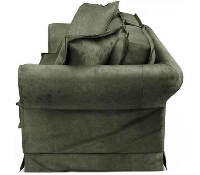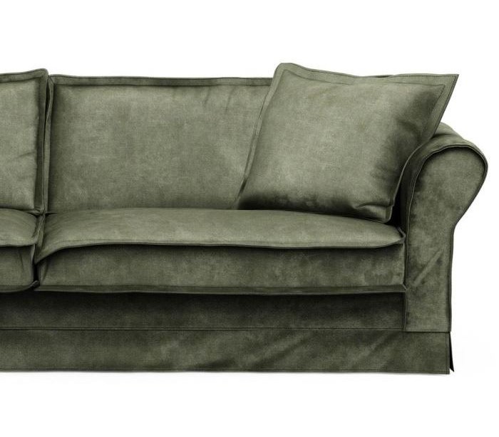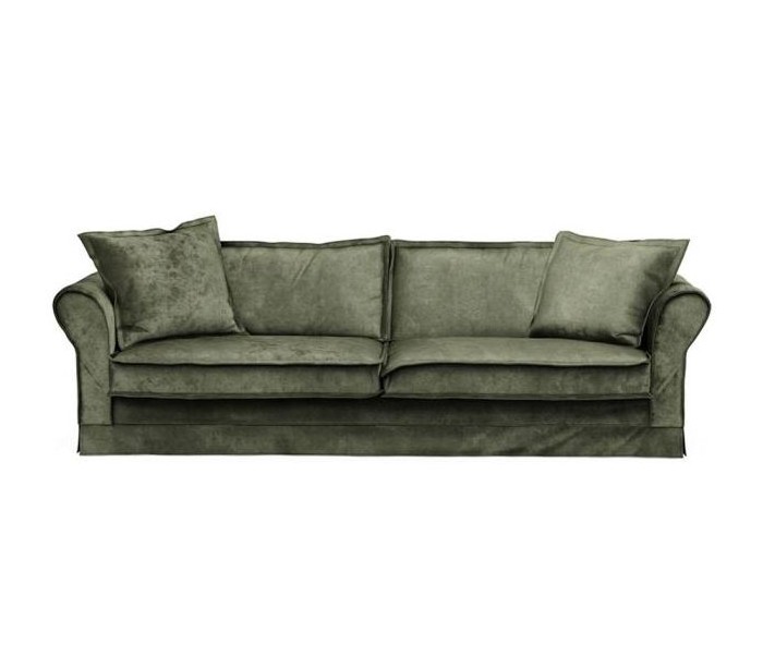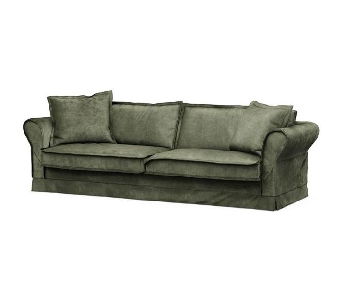 Riviera Maison 3,5 personers i et luksuriøst design af efeu grøn velour. Sofaen måler 79 cm i højden over ryggen og 255 cm i bredden.