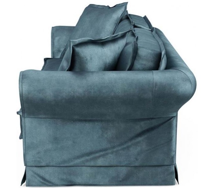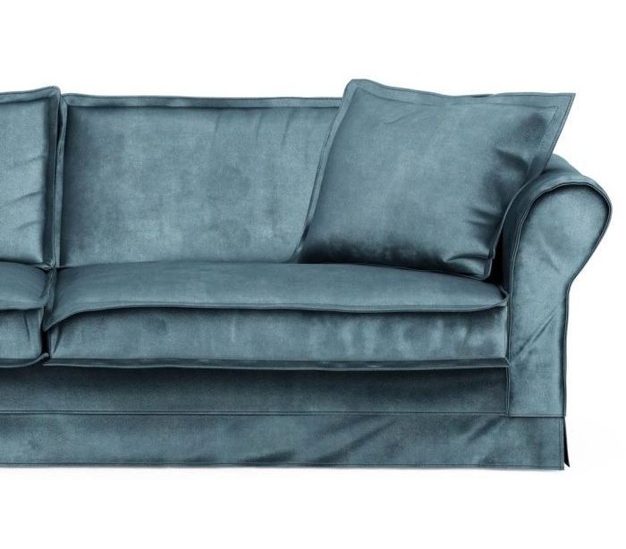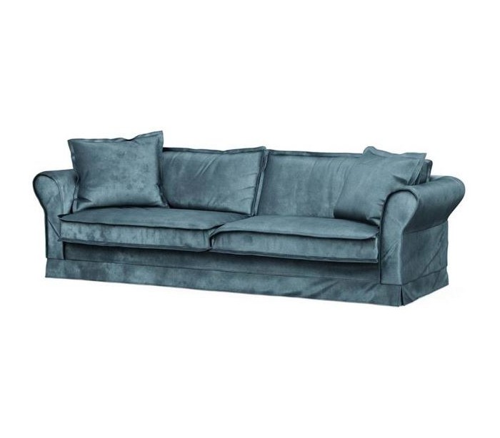 Riviera Maison 3,5 personers i et luksuriøst design af petroliumsfarvet velour. Sofaen måler 79 cm i højden over ryggen og 255 cm i bredden.