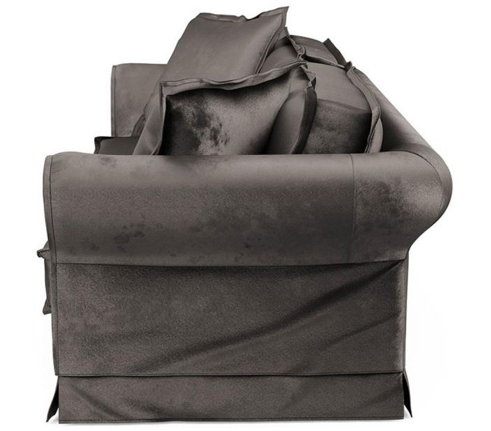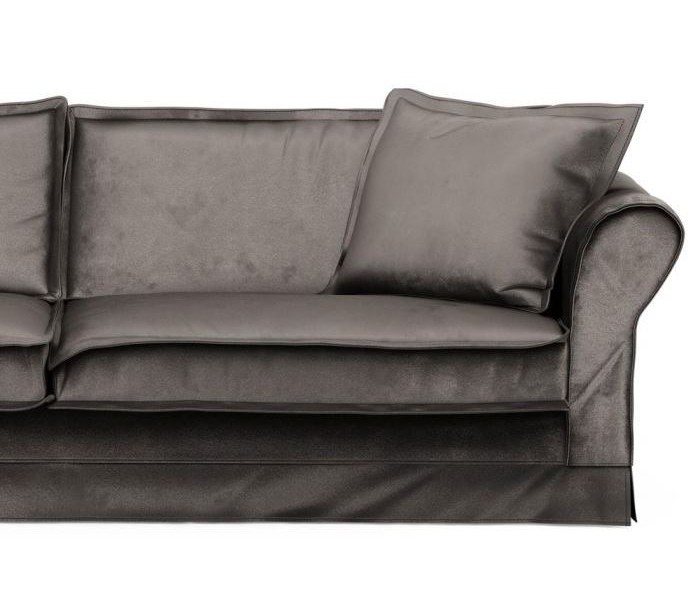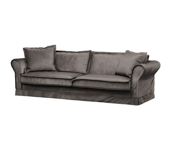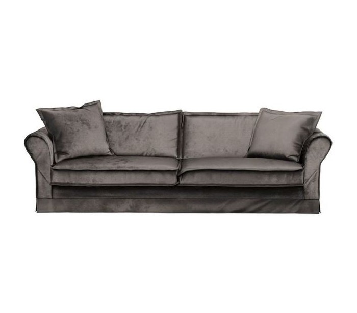 Riviera Maison 3,5 personers i et luksuriøst design af grå velour. Sofaen måler 79 cm i højden over ryggen og 255 cm i bredden.