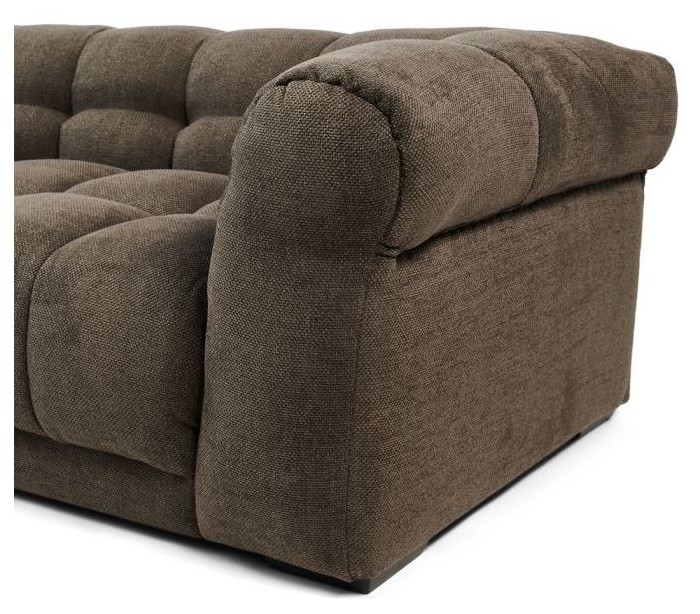 Riviera Maison 3,5 personers sofa i et luksuriøst design af jordbrun polyester og ben i sortlakeret træ. Sofaen måler 68 cm i højden over ryggen og 235 cm i bredden.