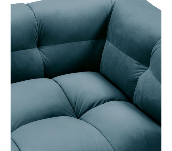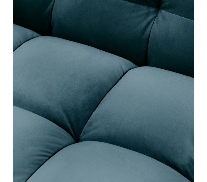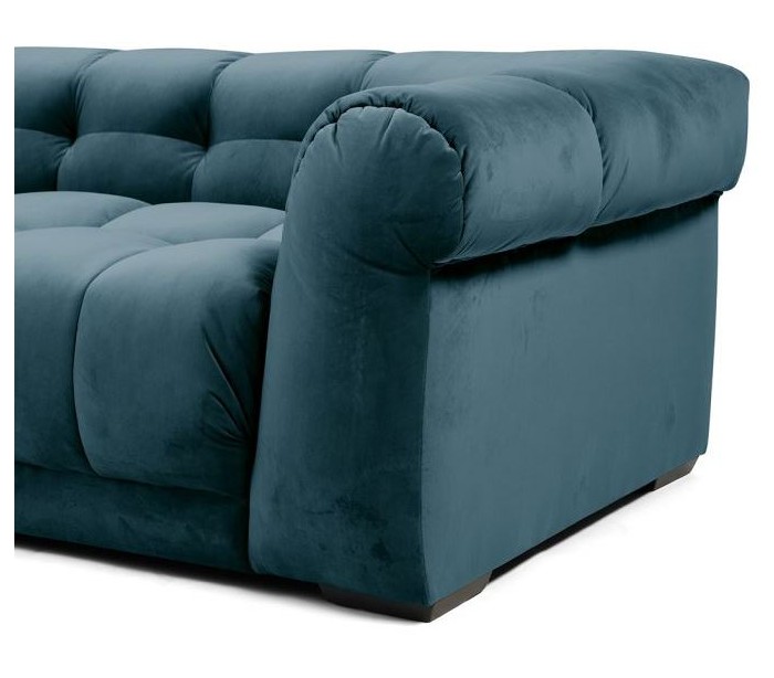 Riviera Maison 3,5 personers sofa i et luksuriøst design af petroliumsfarvet velour og ben i sortlakeret træ. Sofaen måler 68 cm i højden over ryggen og 235 cm i bredden.
