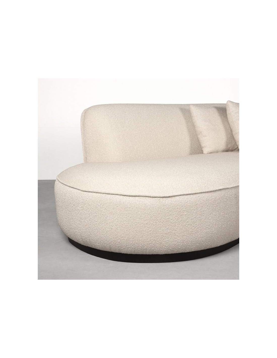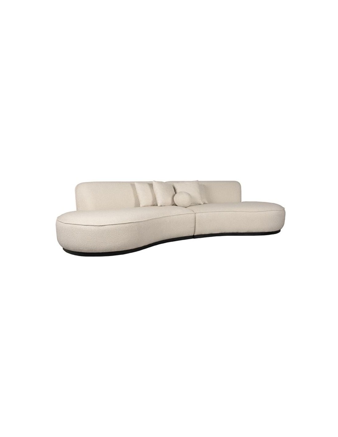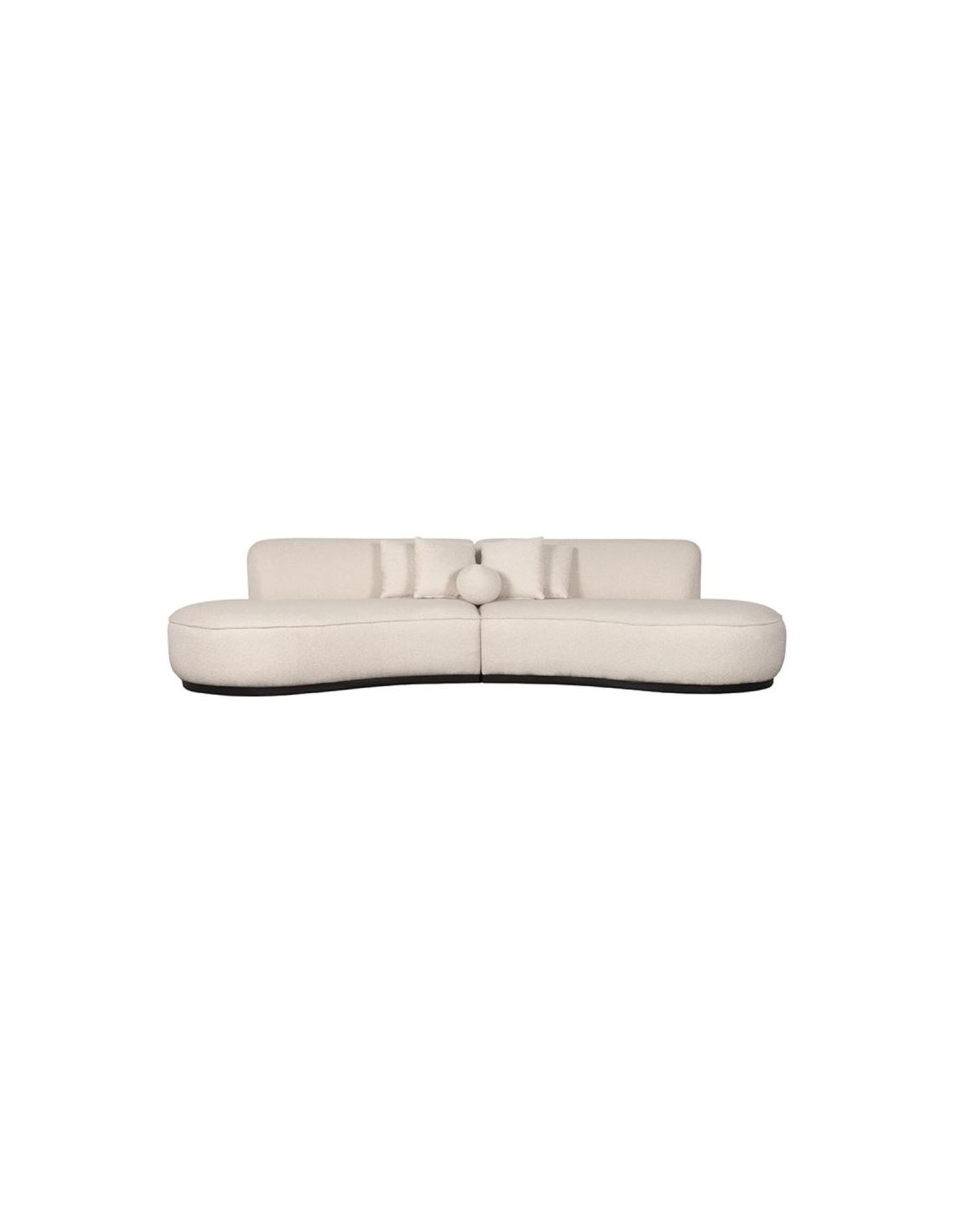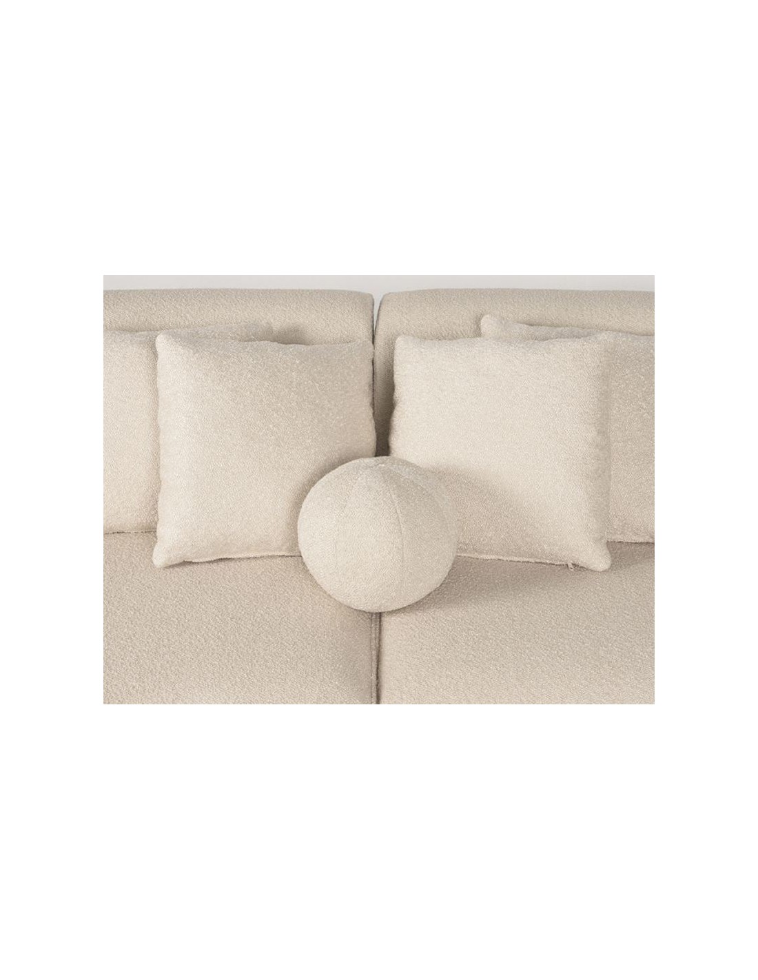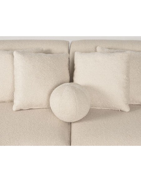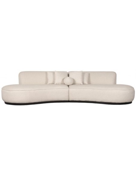 Mori 4-personers sofa, udført i et moderne og lækkert design af beige bouclé tekstil. Sofaen måler 340 cm i bredden og 110 cm i dybden (sofaen buer lidt) og er polstret med højkvalitets skum og fjedre. En lækker blød sofa der virkelig kan slænges på. Sofaens bund er i sortlakeret træ. Der medfølger 4 firkantede puder 40 x 40 cm i samme tekstil samt 1 rund pude.