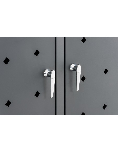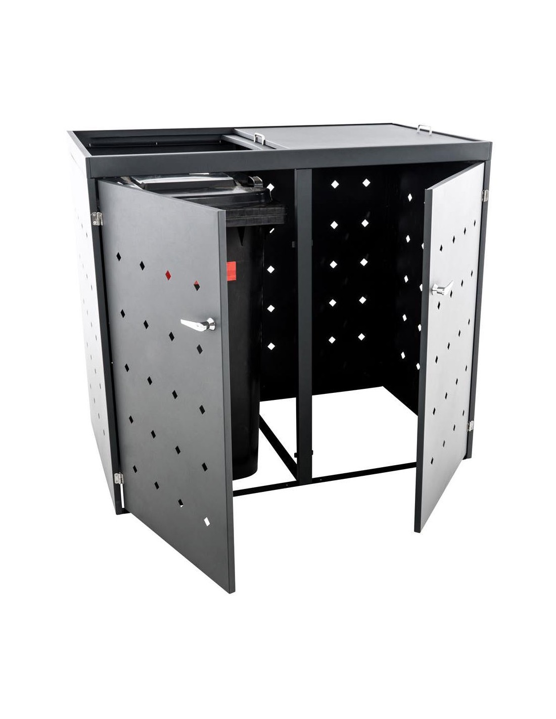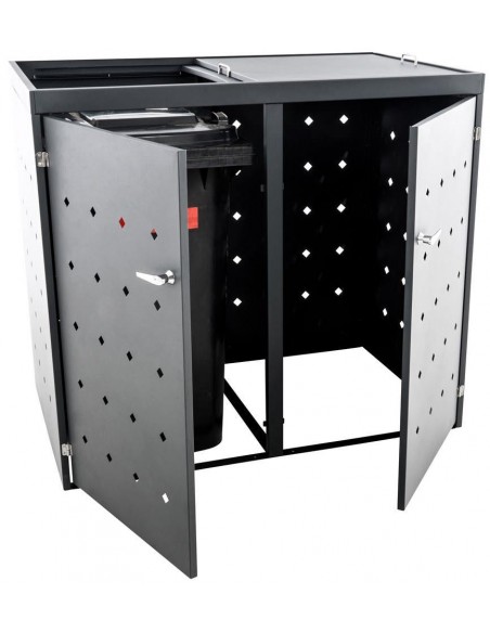 Affaldsskjuler med låg, til 2 skraldespande, udført i et moderne og stilrent design af stål. Affaldsskjuleren måler 116 cm i højden og 132 x 80 cm i bredde og dybde. Lågene på affaldsskjuleren er med skydemekanisme, der letter adgangen til skraldespanden derunder.