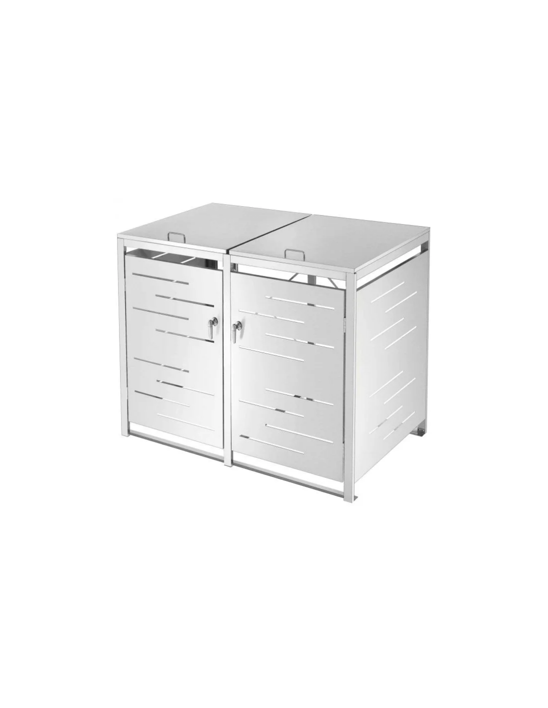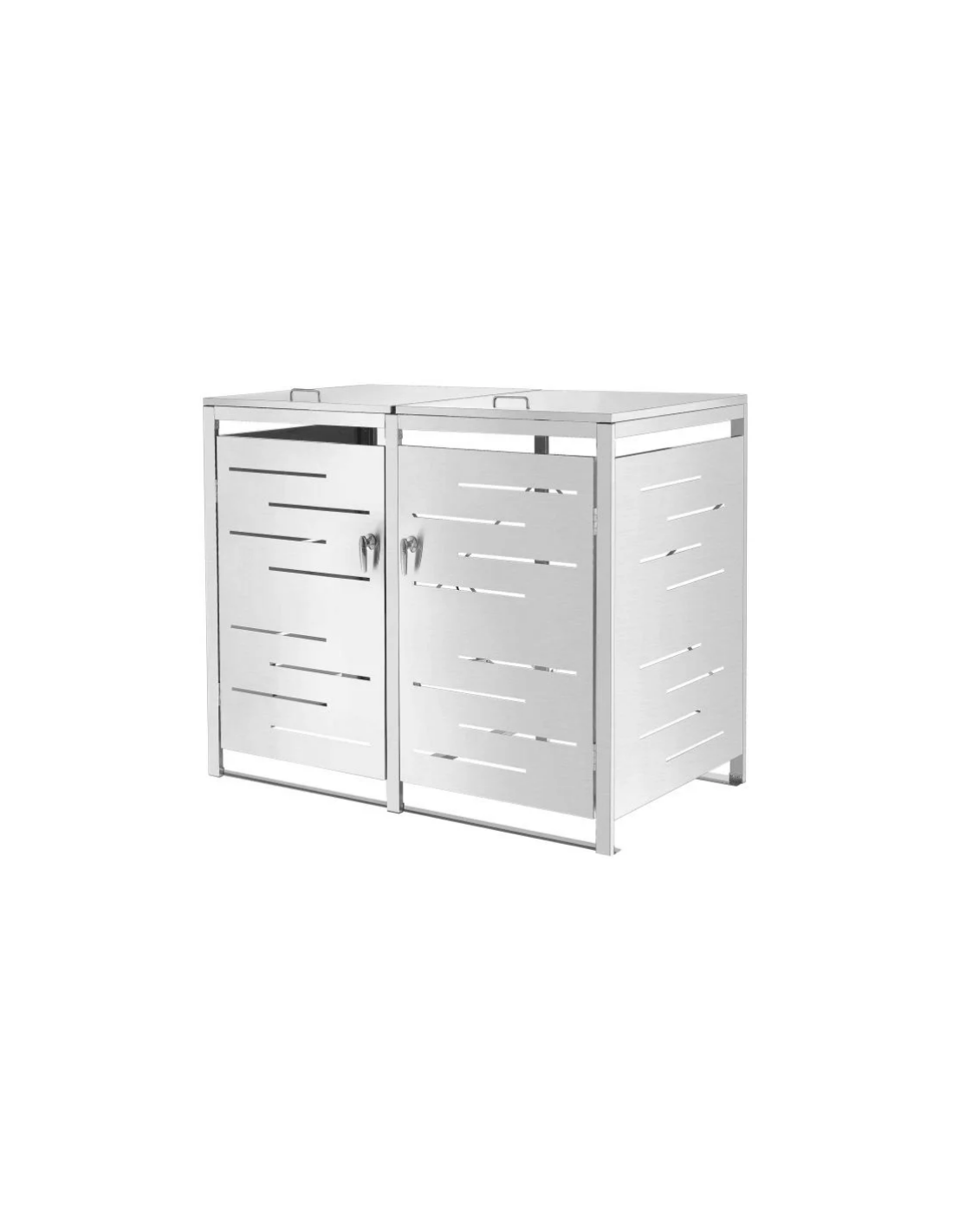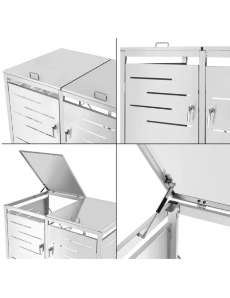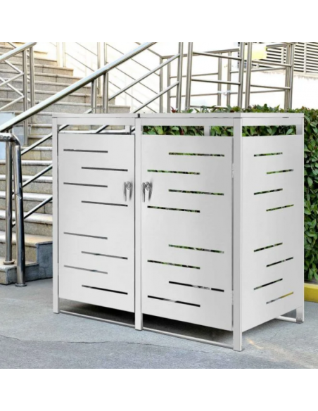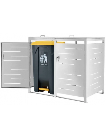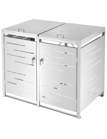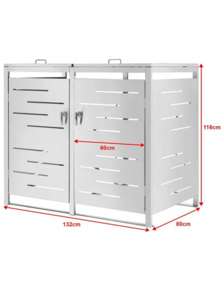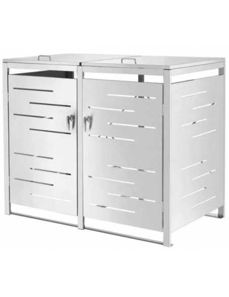 Affaldsskjuler med låg, til 2 skraldespande, udført i et moderne og stilrent design af rustfri stål. Affaldsskjuleren måler 116 cm i højden og 132 x 80 cm i bredde og dybde.