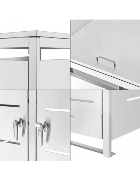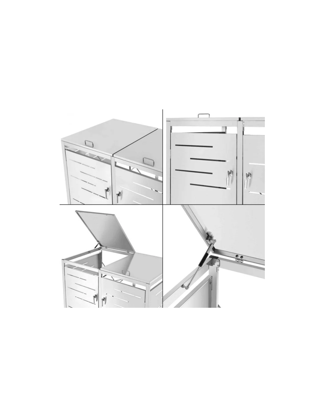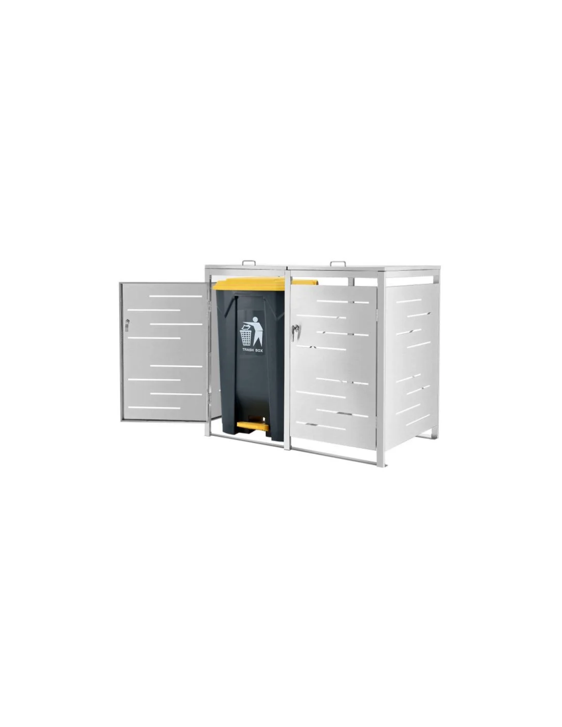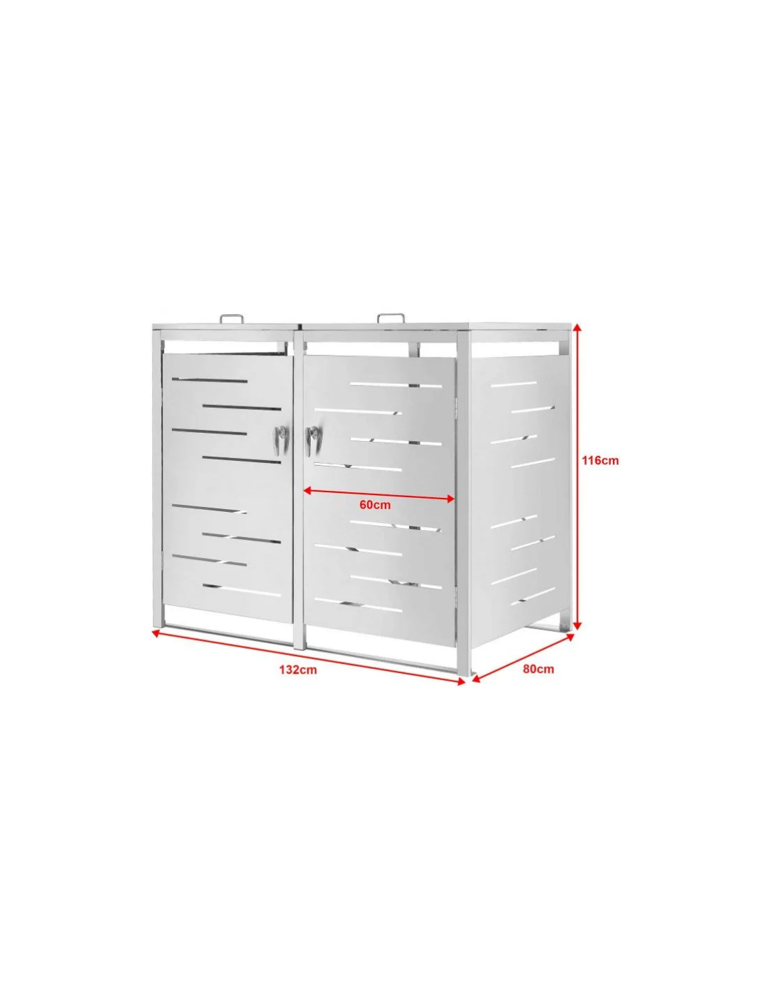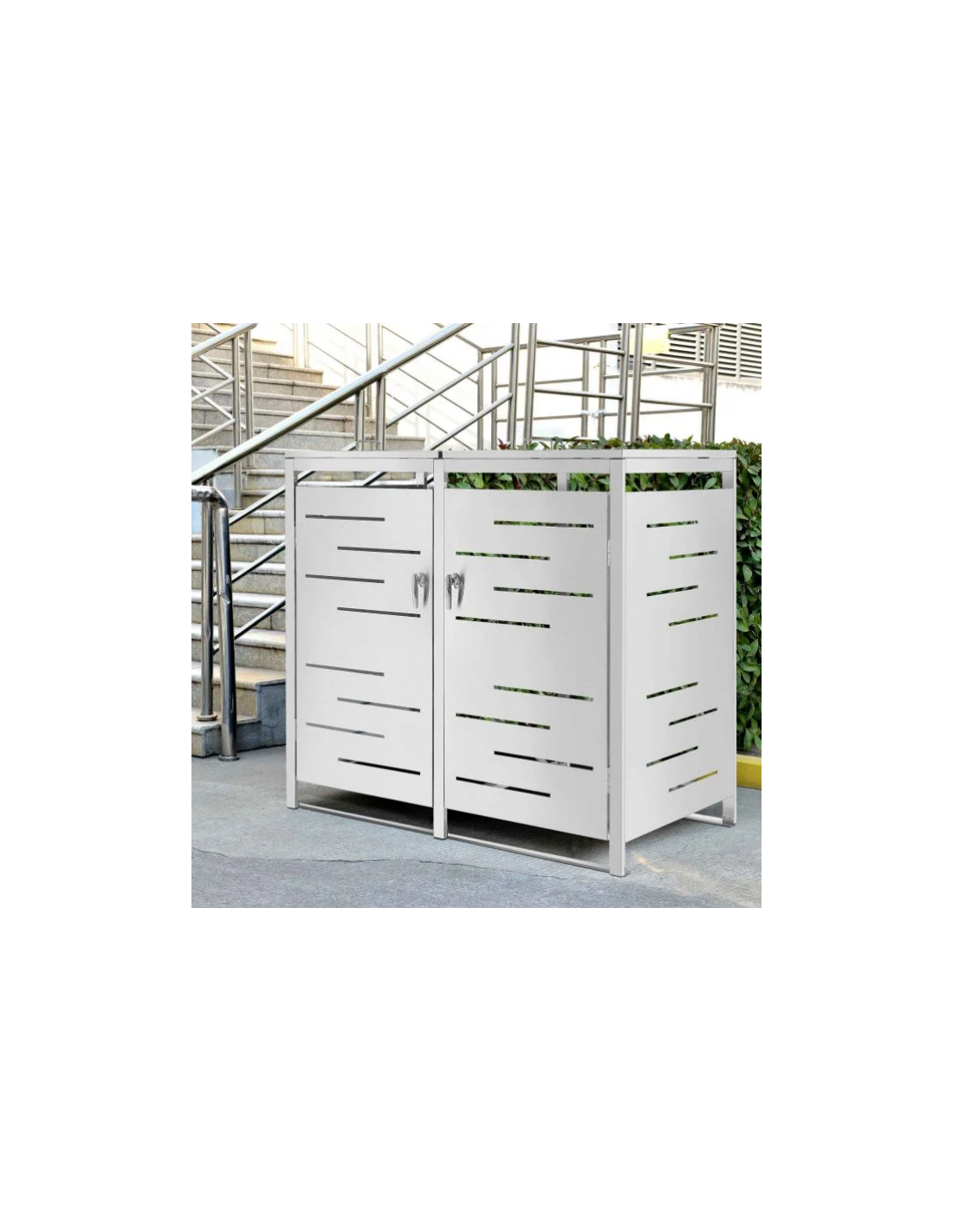 Affaldsskjuler med låg, til 2 skraldespande, udført i et moderne og stilrent design af rustfri stål. Affaldsskjuleren måler 116 cm i højden og 132 x 80 cm i bredde og dybde.