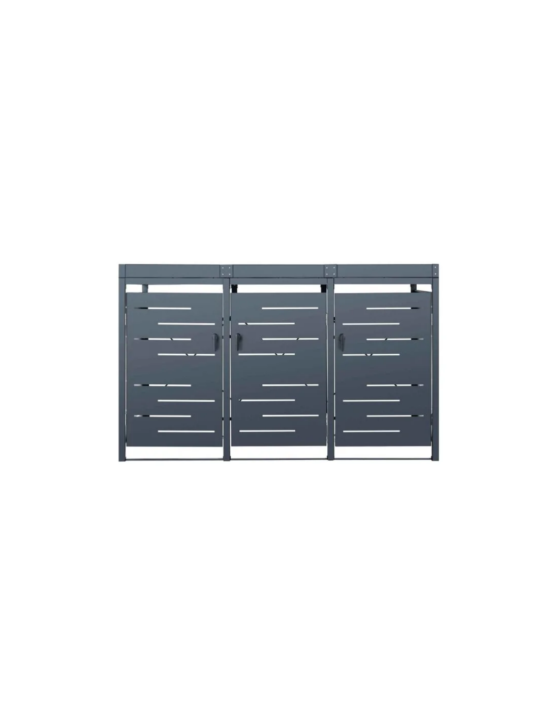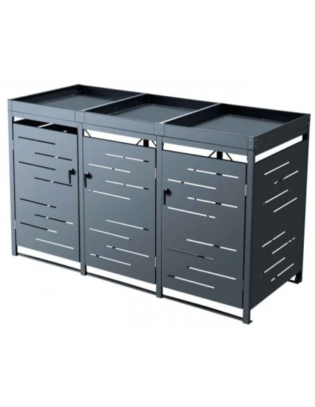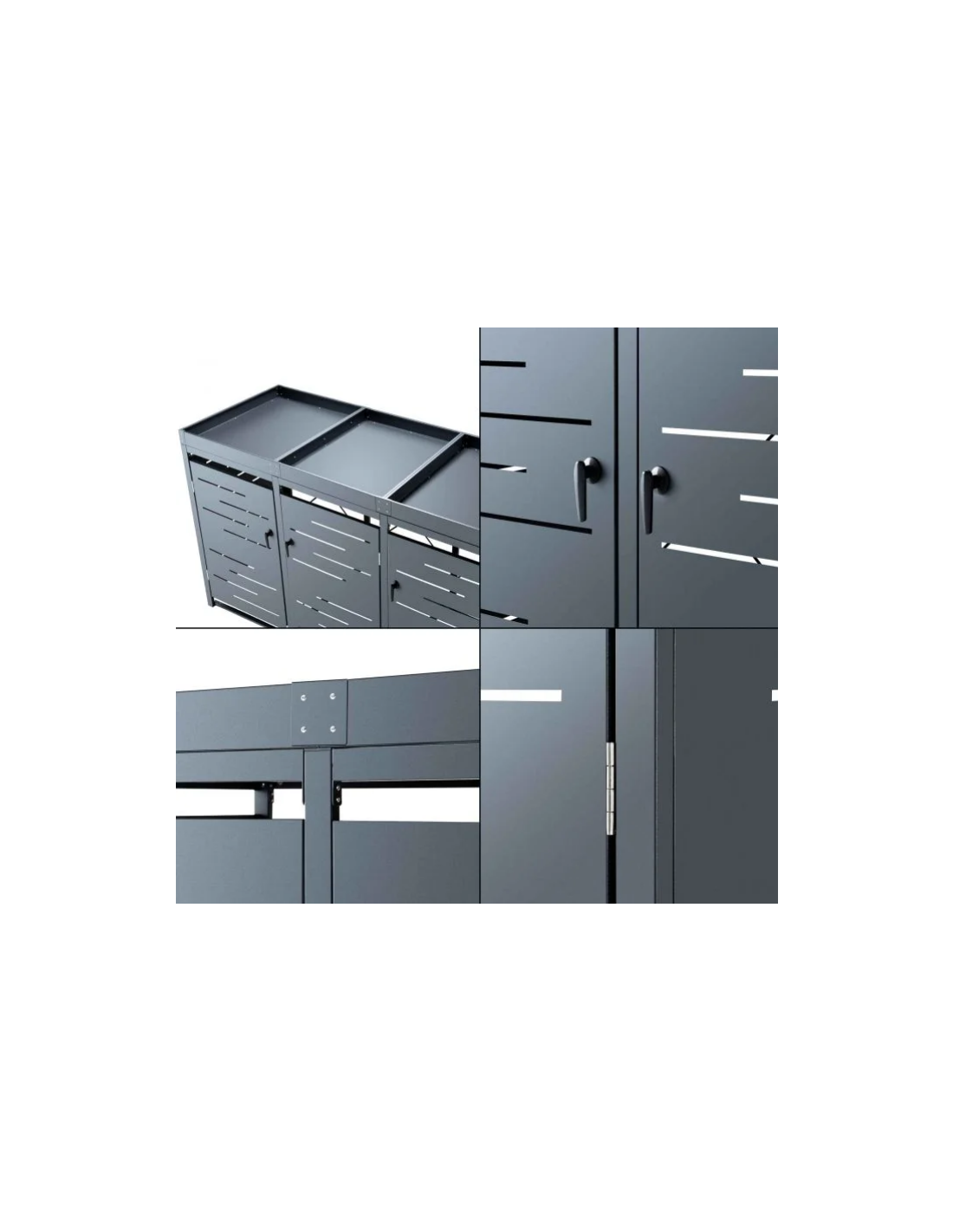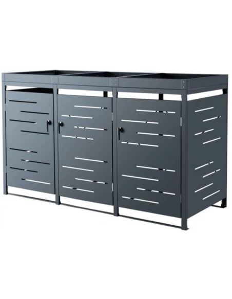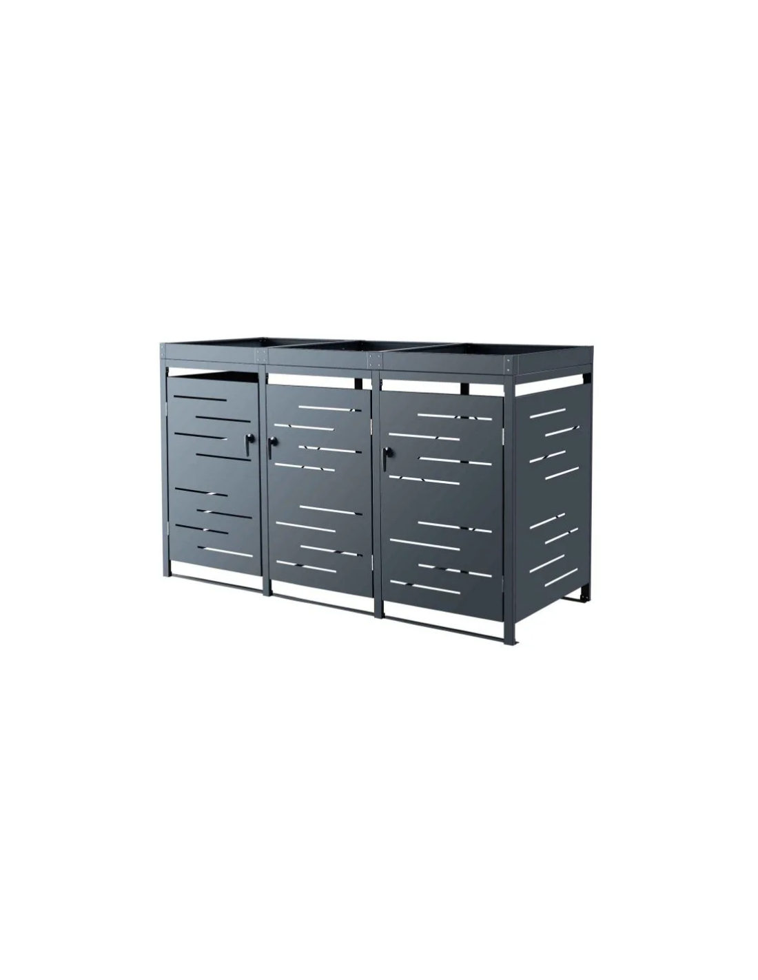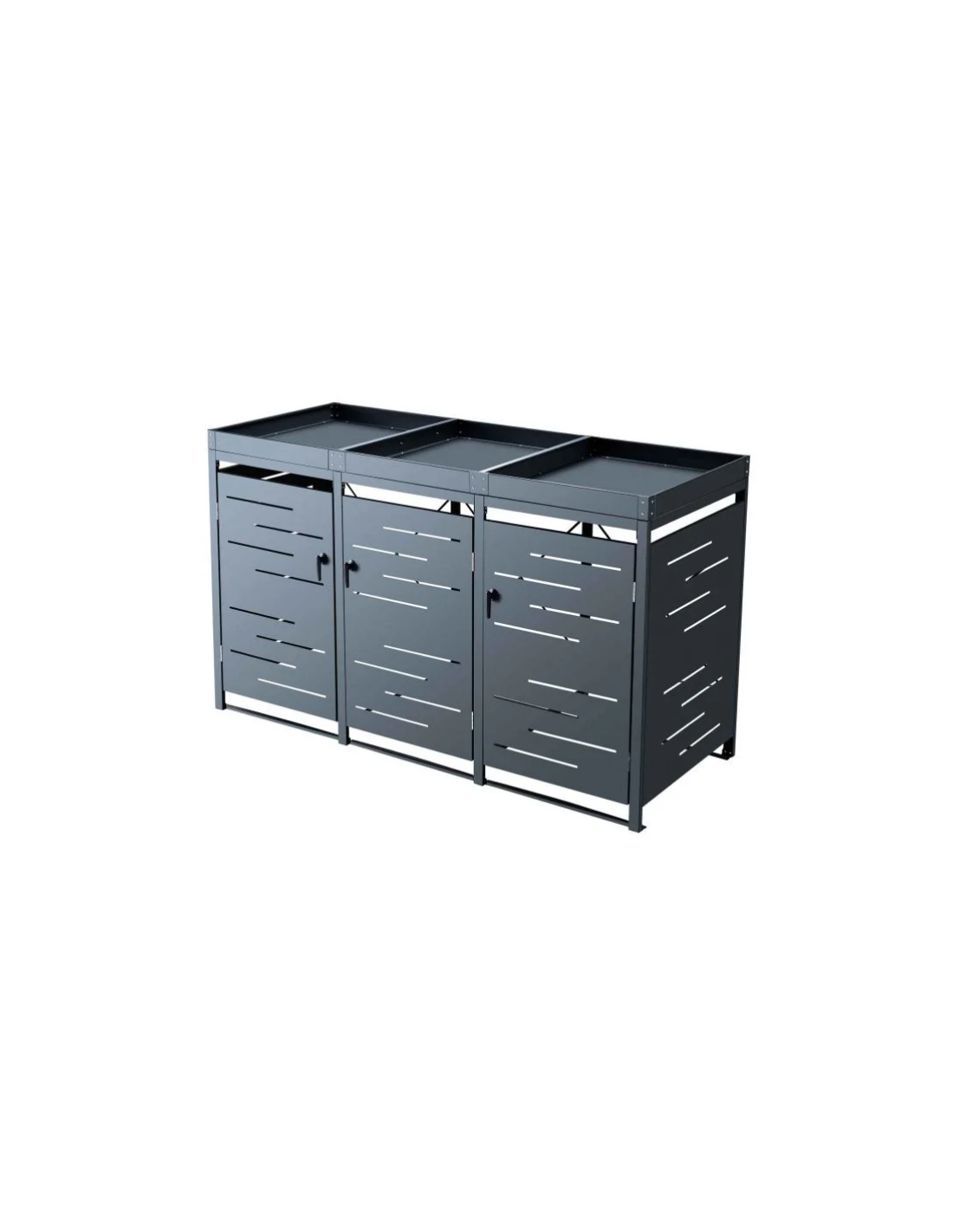 Affaldsskjuler til 3 skraldespande, udført i et moderne og stilrent design af antracitlakeret stål. Affaldsskjuleren måler 122 cm i højden og 196 x 80 cm i bredde og dybde. På toppen kan der eventuelt sættes beplantning.