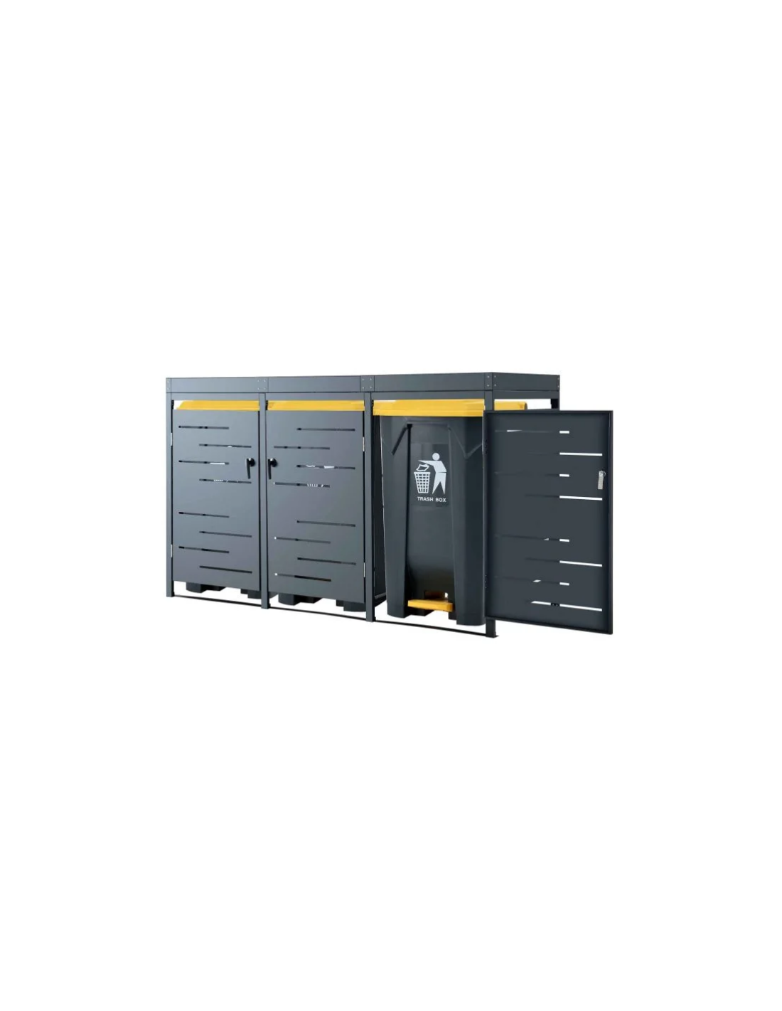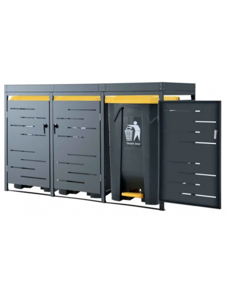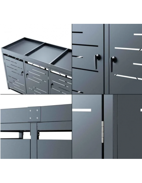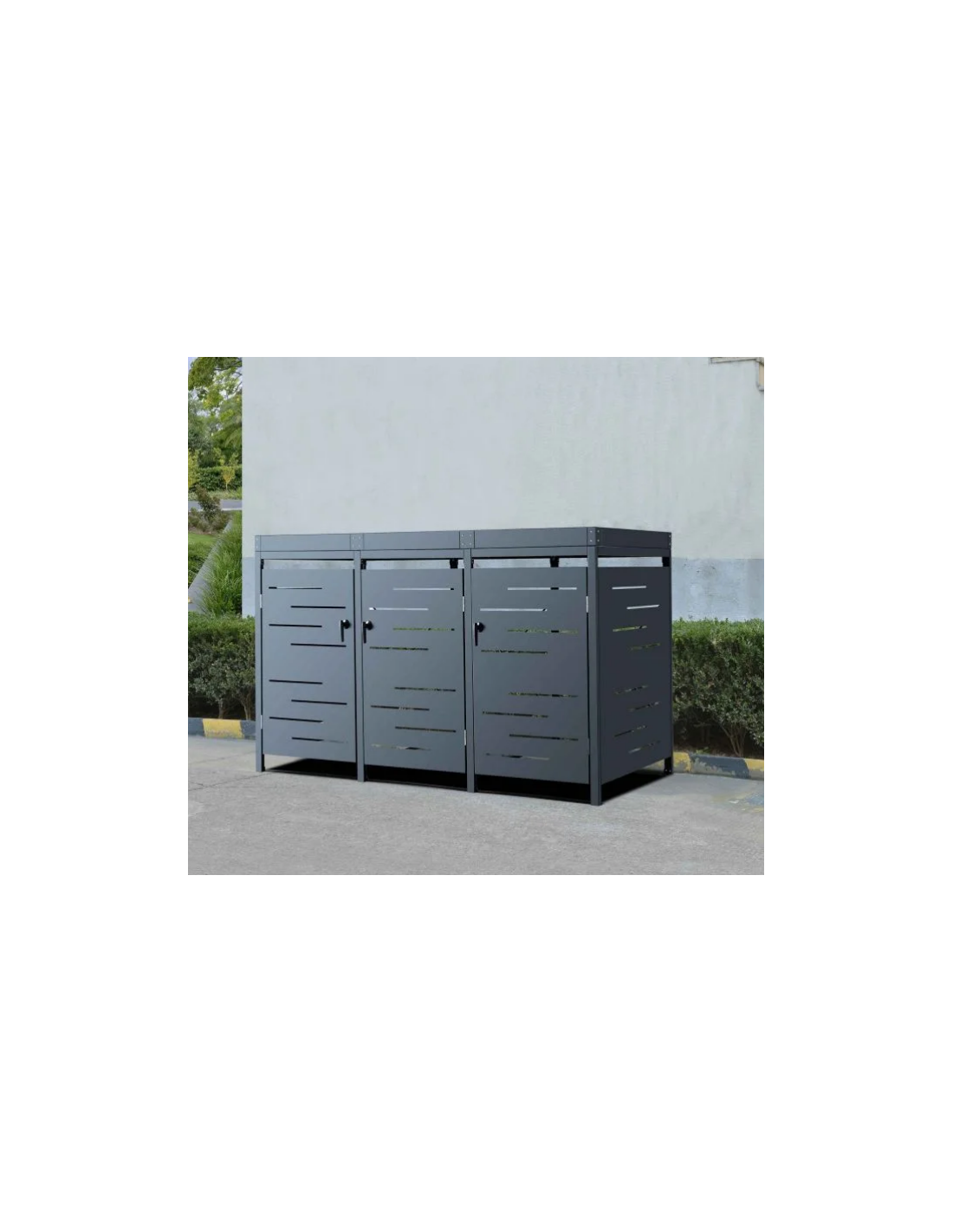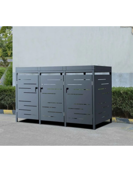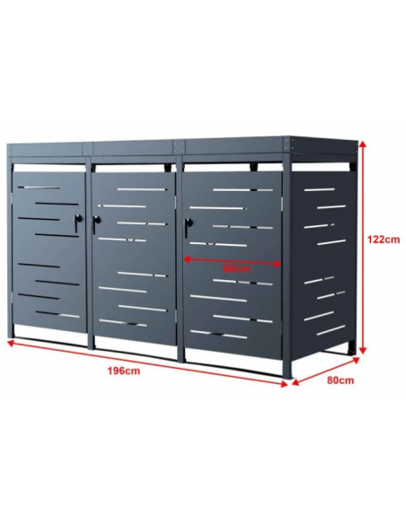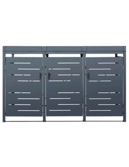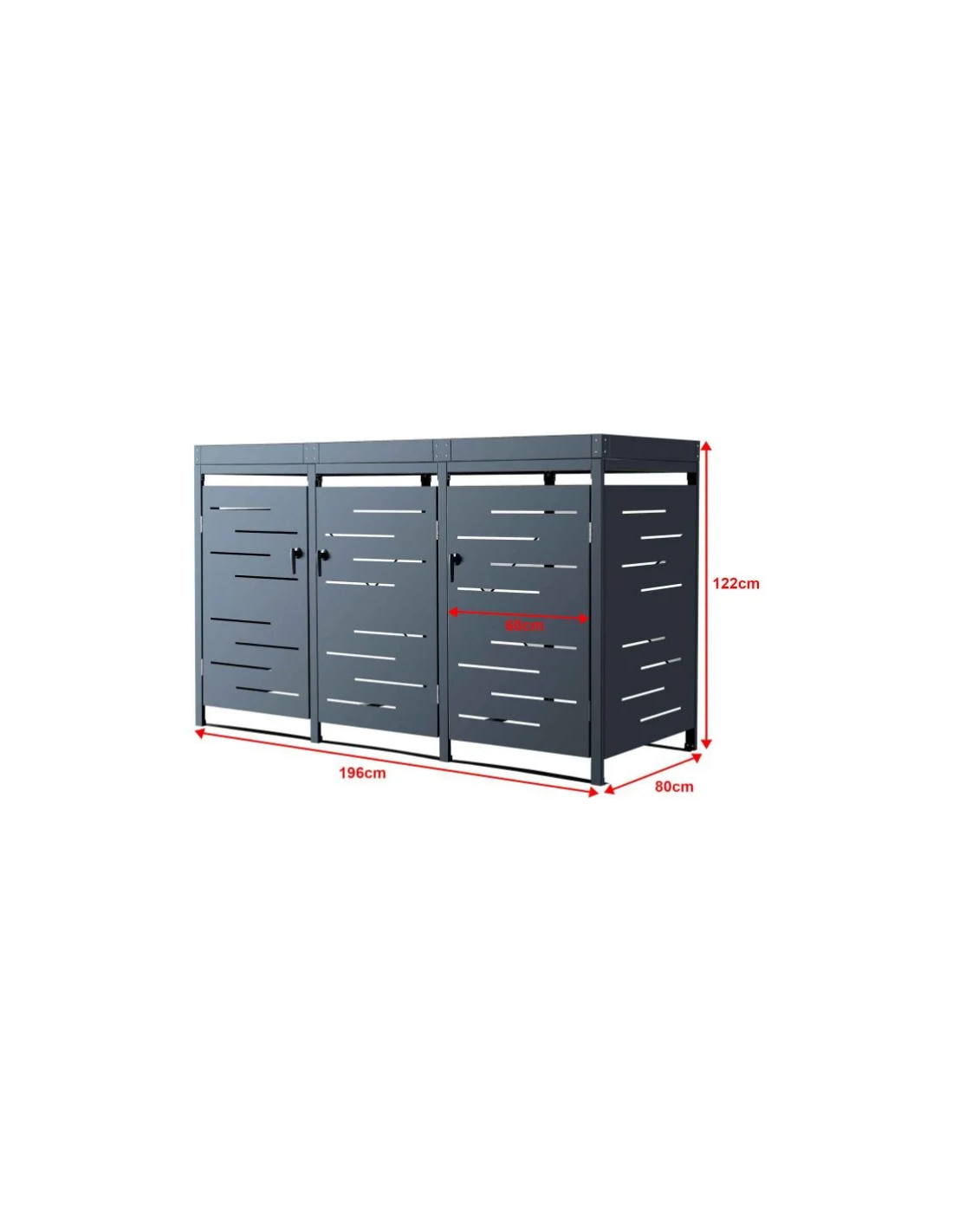 Affaldsskjuler til 3 skraldespande, udført i et moderne og stilrent design af antracitlakeret stål. Affaldsskjuleren måler 122 cm i højden og 196 x 80 cm i bredde og dybde. På toppen kan der eventuelt sættes beplantning.