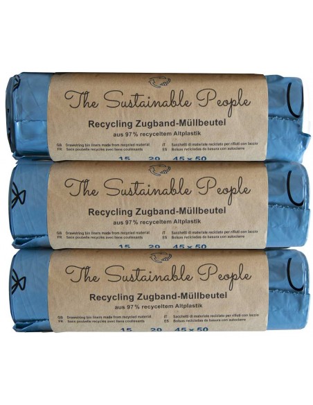 ReCollector affaldsposer i 3 pak. Disse poser fra The Sustainable People er lavet af 97% genbrugsplast. Affaldsposerne er både rivefaste, vandfaste og har en snøre, der gør dem nemme at binde knude på og bære ud. Posen kan rumme 20 liter og måler 45 x 50 cm og hver rulle indeholder 15 poser.
