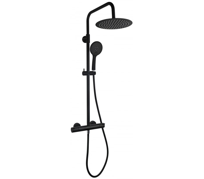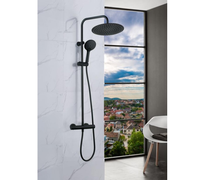 Nortiq luksus brusesæt med termostat, udført i et moderne design af mat sort metal. Armaturet måler 84 cm i højden og kan justeres til personhøjden. Premium håndbruser med nyudviklet silicone dyser, hvor dysserne renser sig selv. De elastiske dyser giver desuden en behagelig blød stråle. Clear Stream håndbruser. Brusehovedet giver dig en lækker spaoplevelse med det store skyld fra hovedbruseren på Ø25 cm. Håndbruseren kommer med 5 strålefunktioner.