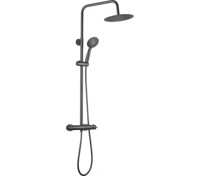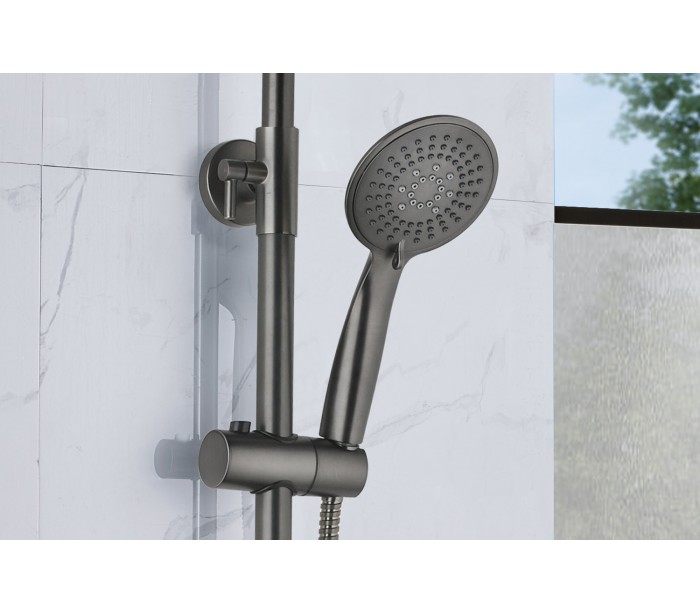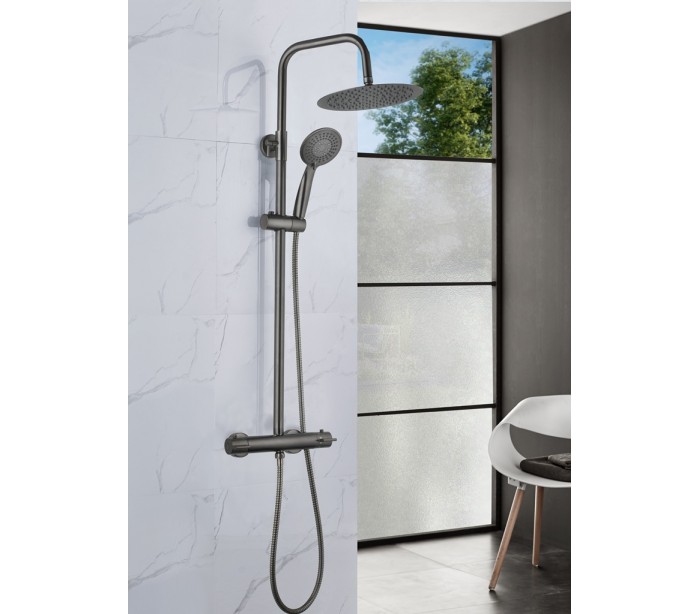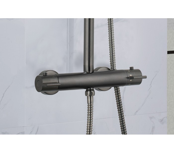 Nortiq brusesæt med termostat, udført i et moderne design af gun black lakeret metal. Armaturet måler 84 cm i højden og kan justeres til personhøjden. Premium håndbruser med nyudviklet silicone dyser, hvor dysserne renser sig selv. De elastiske dyser giver desuden en behagelig blød stråle. Clear Stream håndbruser. Brusehovedet giver dig en lækker spaoplevelse med det store skyld fra hovedbruseren på Ø22 cm. Håndbruseren kommer med 3 strålefunktioner.