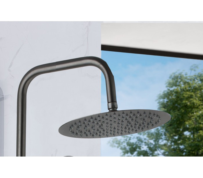 Nortiq brusesæt med termostat, udført i et moderne design af gun black lakeret metal. Armaturet måler 84 cm i højden og kan justeres til personhøjden. Premium håndbruser med nyudviklet silicone dyser, hvor dysserne renser sig selv. De elastiske dyser giver desuden en behagelig blød stråle. Clear Stream håndbruser.