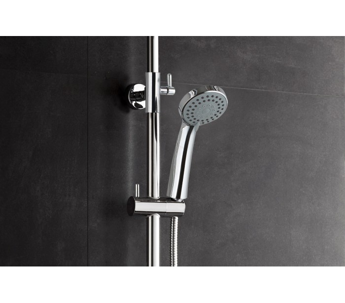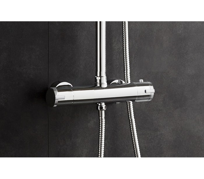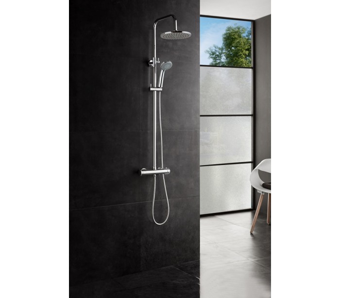 Nortiq brusesæt med termostat, udført i et moderne design af kromlakeret metal. Armaturet måler 84 cm i højden og kan justeres til personhøjden. Håndbruser med nyudviklet silicone dyser, hvor dysserne renser sig selv. De elastiske dyser giver desuden en behagelig blød stråle. Brusehovedet giver dig en lækker spaoplevelse med det store skyld fra hovedbruseren på Ø22 cm. Håndbruseren kommer med 3 strålefunktioner.