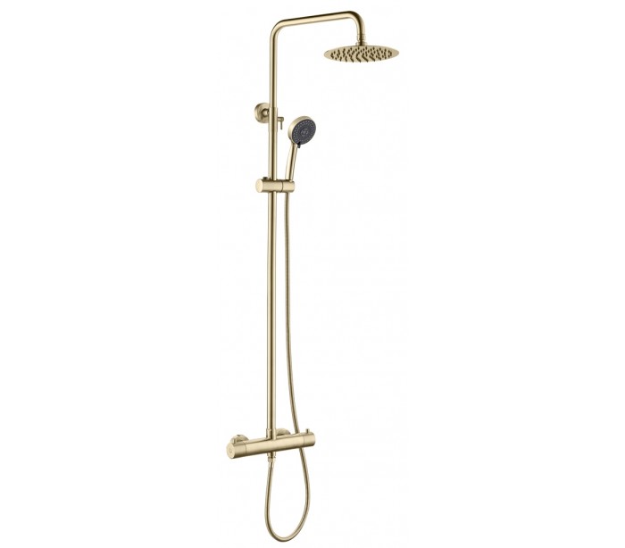 Nortiq luksus brusesæt med termostat, udført i et moderne design af antik messinglakeret metal. Armaturet måler 84 cm i højden og kan justeres til personhøjden. Premium håndbruser med nyudviklet silicone dyser, hvor dysserne renser sig selv. De elastiske dyser giver desuden en behagelig blød stråle. Clear Stream håndbruser. Brusehovedet giver dig en lækker spaoplevelse med det store skyld fra hovedbruseren på Ø25 cm. Håndbruseren kommer med 5 strålefunktioner.