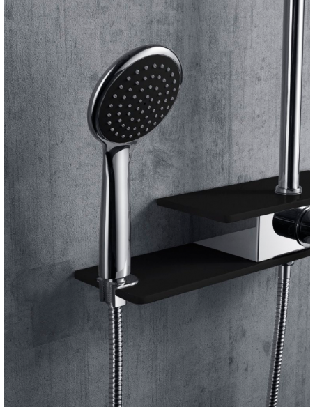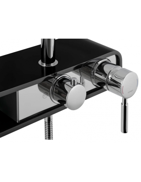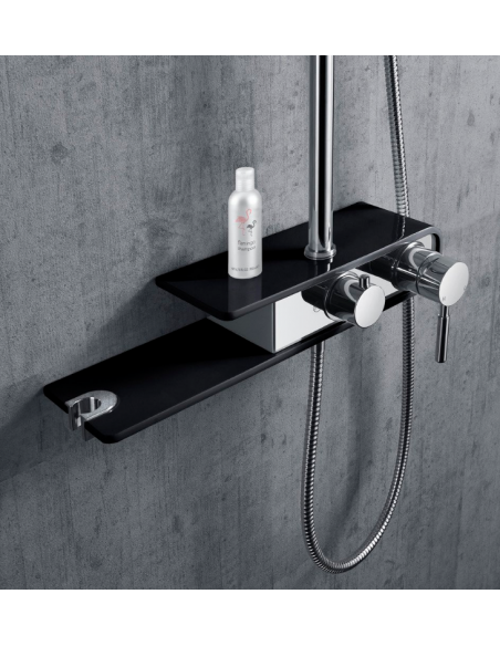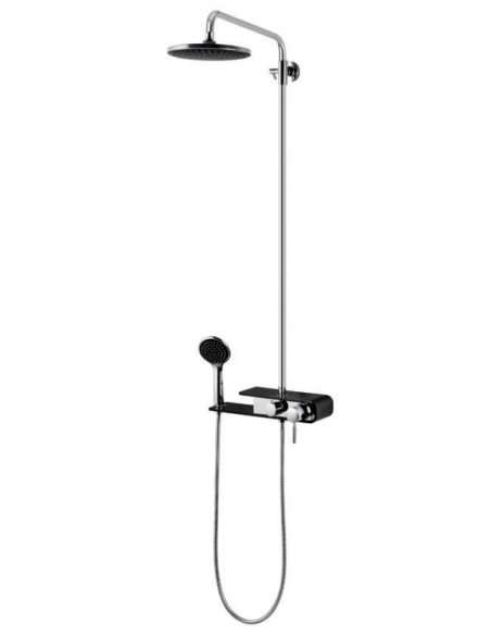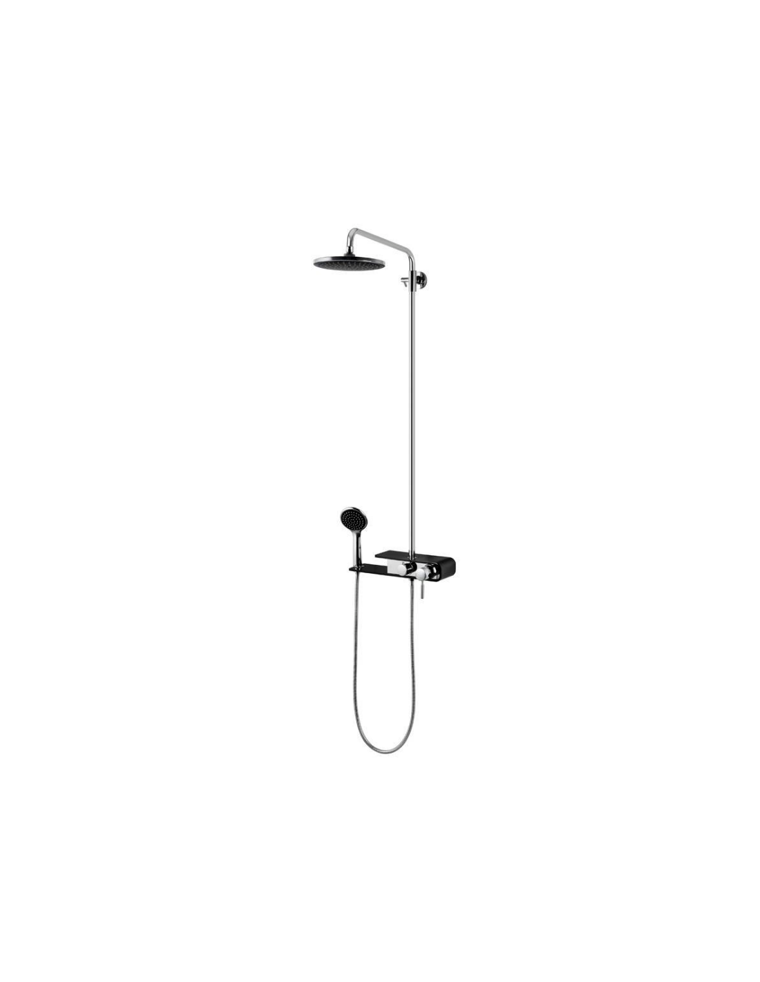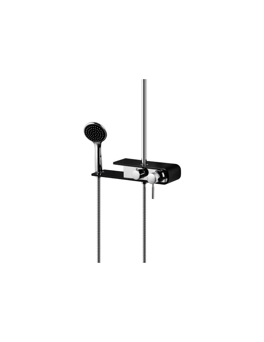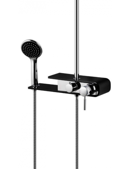 FIBER armatur med mixer til bruser, udført i et moderne og stilrent design i krom og sort. Armaturet måler 111 - 176 cm i højden og er fremstillet i stål og messing.