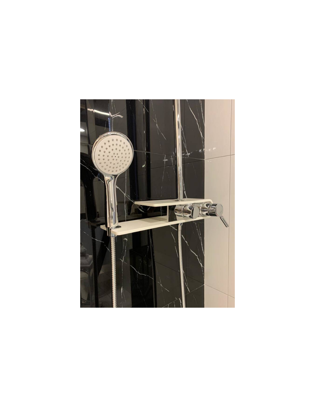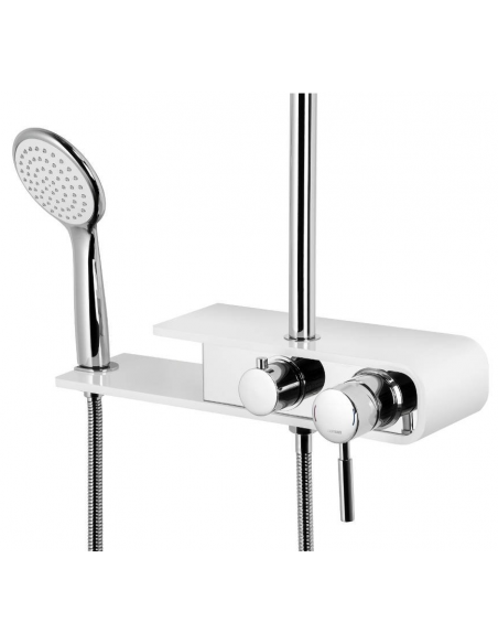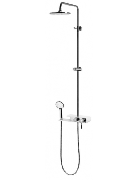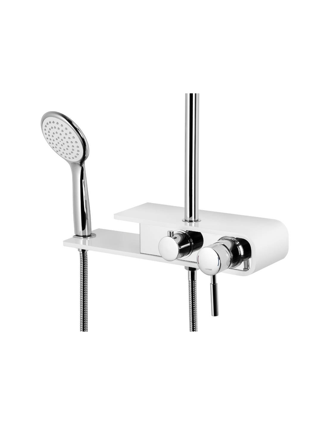 FIBER armatur med mixer til bruser, udført i et moderne og stilrent design i krom og hvid. Armaturet måler 111 - 176 cm i højden og er fremstillet i stål og messing.