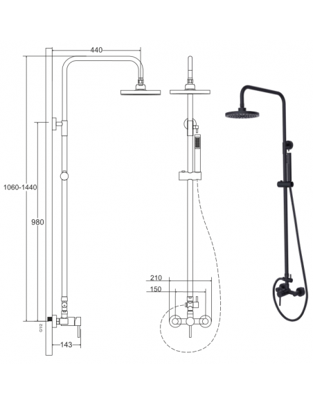 DECCO armatur med mixer til bruser, udført i et moderne og stilrent design i mat sortlakeret messing. Armaturet måler 106 - 144 cm i højden.