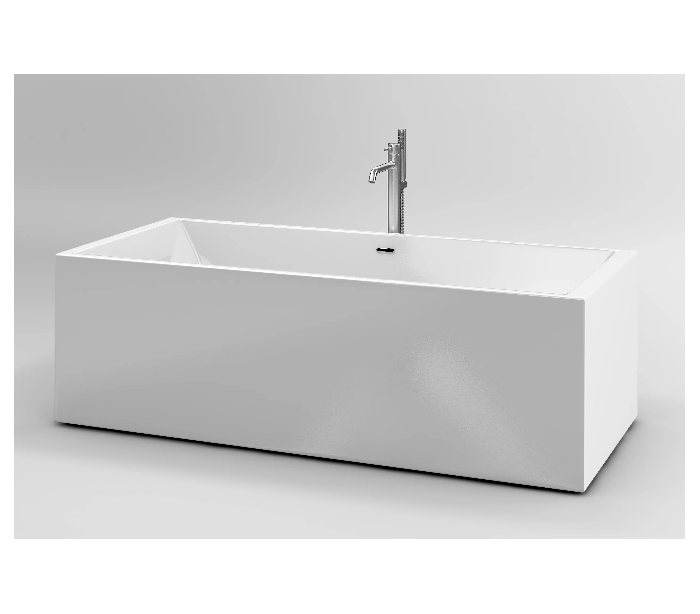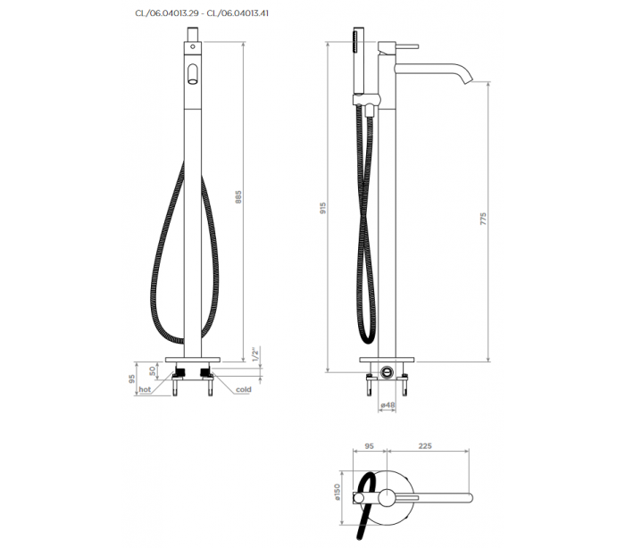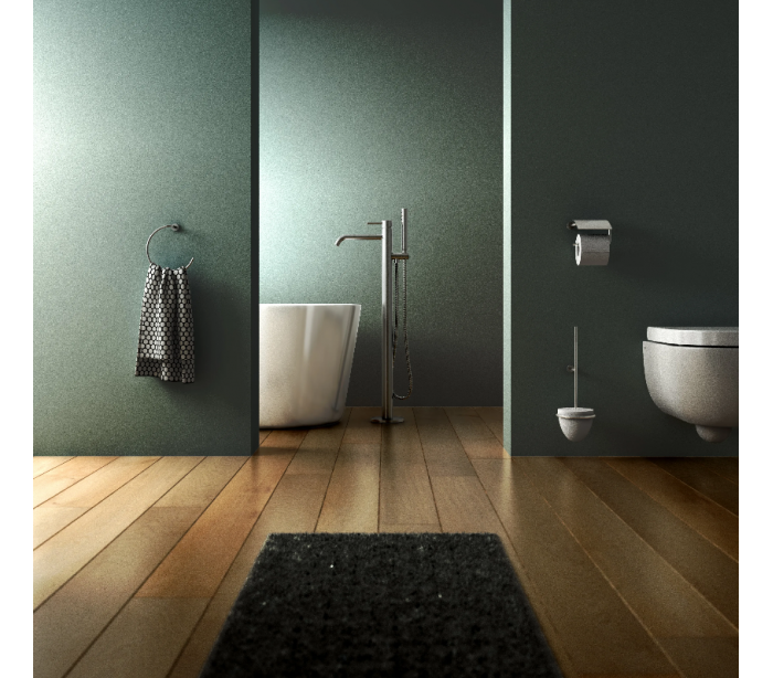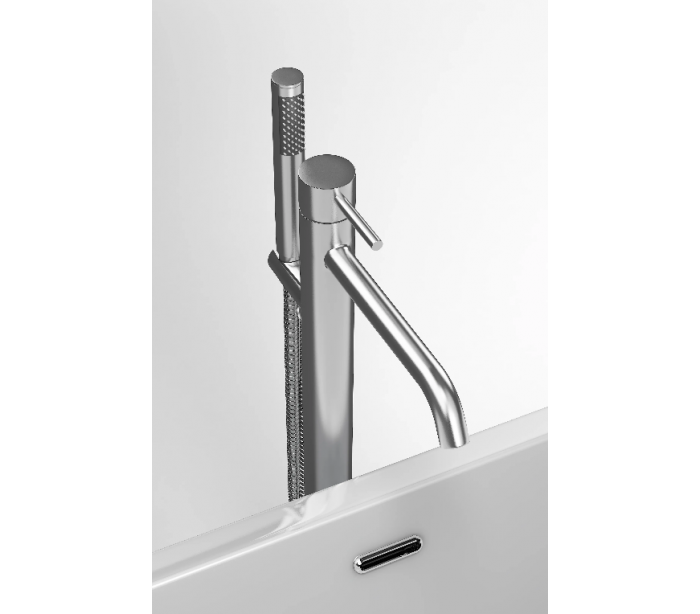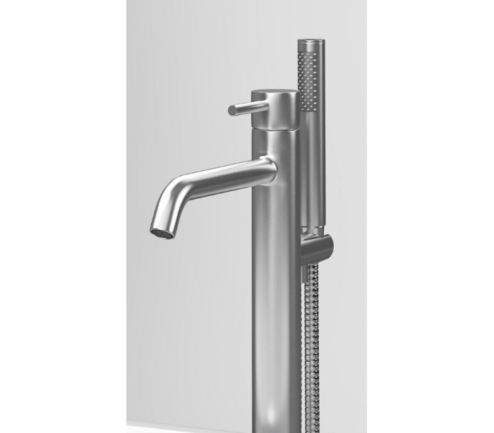 XO 13 gulv armatur til badekar, udført i et moderne design af børstet messing. Armaturet måler 89,65 cm i højden og 22,6 cm i dybde/fremspring. Armaturet kommer med håndbruser.