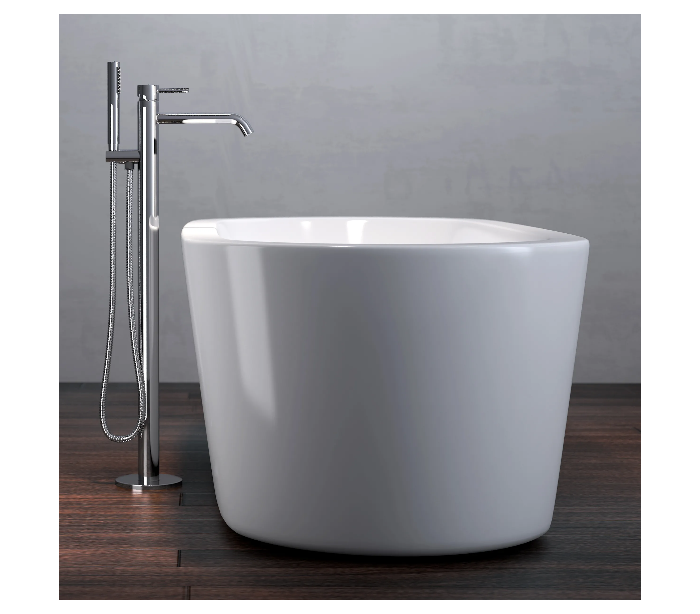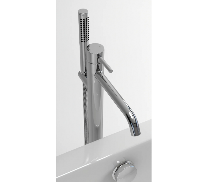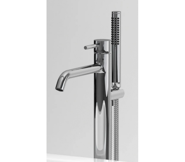 XO 13 gulv armatur til badekar, udført i et moderne design af kromlakeret messing. Armaturet måler 89,65 cm i højden og 22,6 cm i dybde/fremspring. Armaturet kommer med håndbruser.