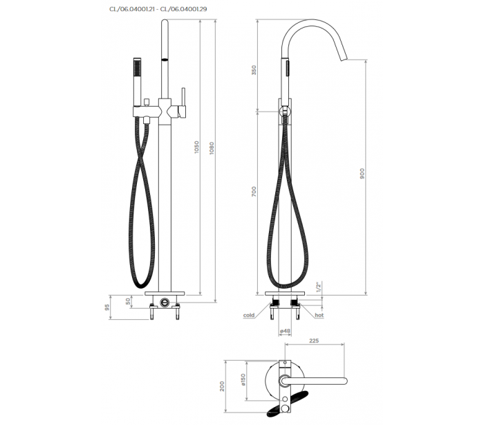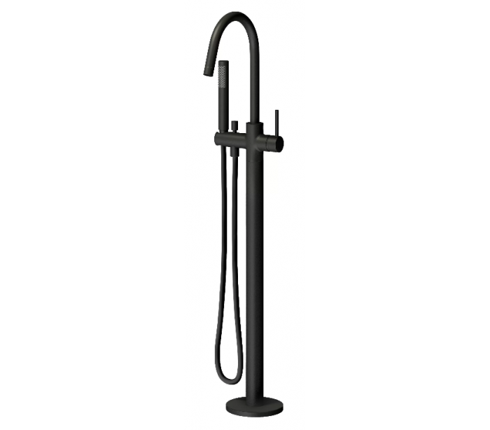 XO 1 gulv armatur til badekar, udført i et moderne design af mat sortlakeret messing. Armaturet måler 106 cm i højden og 22,5 cm i dybde/fremspring. Armaturet kommer med håndbruser.