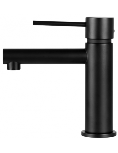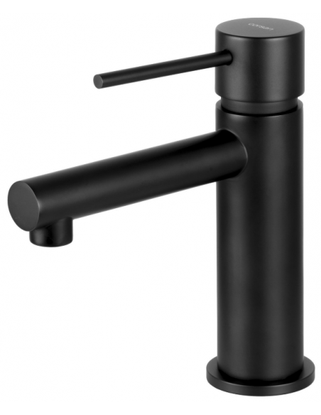 LUGO armatur til håndvaske, udført i et moderne og stilrent design i mat sort. Armaturet måler 16,5 cm i højden og er fremstillet i stål og messing.