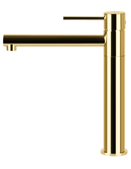 LUGO armatur til håndvaske, udført i et moderne og stilrent design i blank guldfarvet stål og messing. Armaturet måler 26,5 cm i højden.