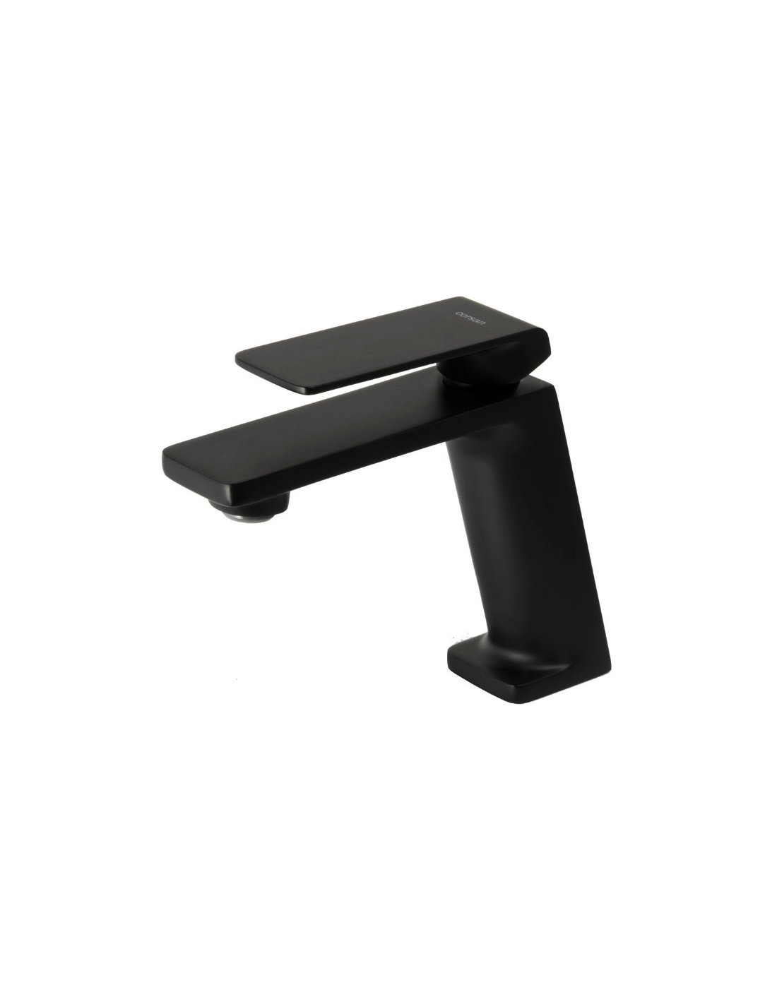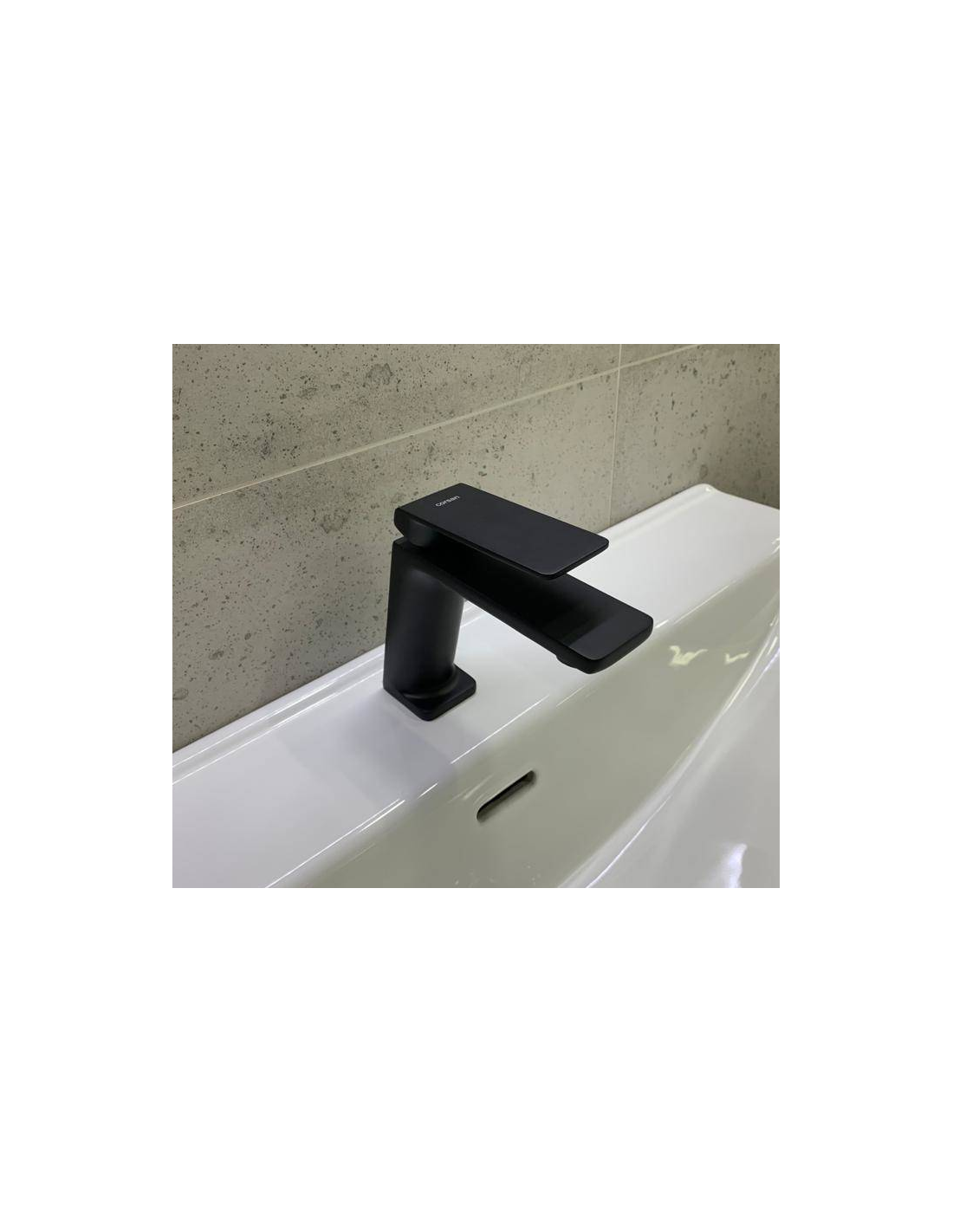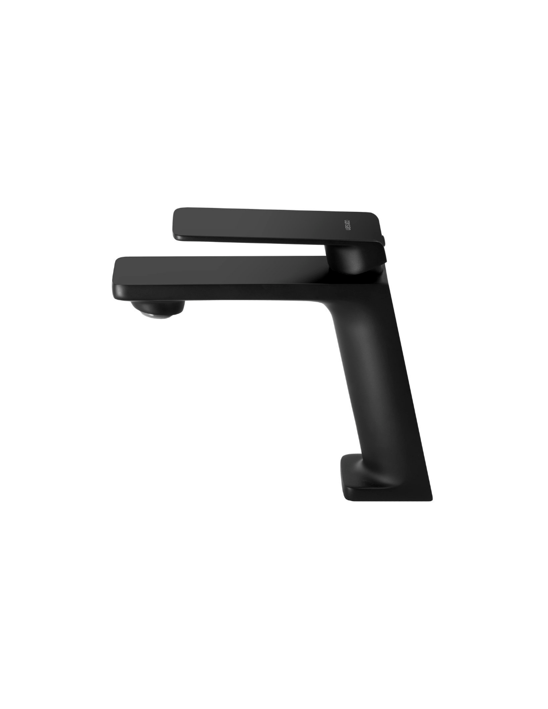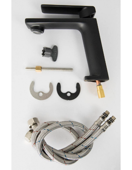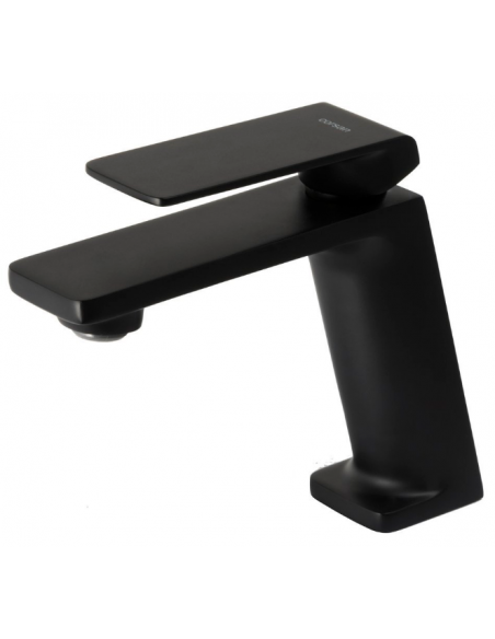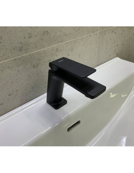 TRINO armatur til håndvaske, udført i et moderne og stilrent design i mat sort. Armaturet måler 14,5 cm i højden og er fremstillet i stål og messing.
