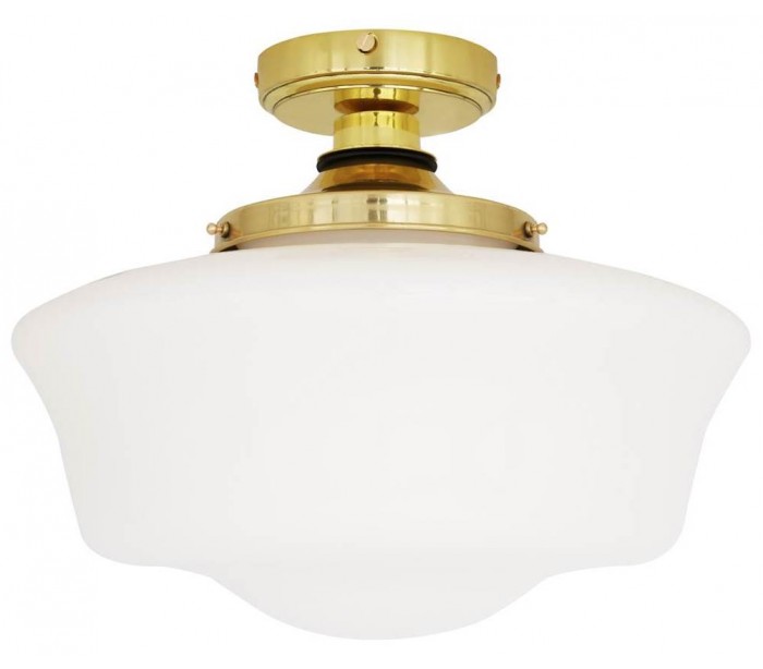 Anath badeværelseslampe i et design i poleret messing og med skærm i satineret hvid glas. Lampen måler 36 cm i diameter og med en højde/fremspring på 30 cm.