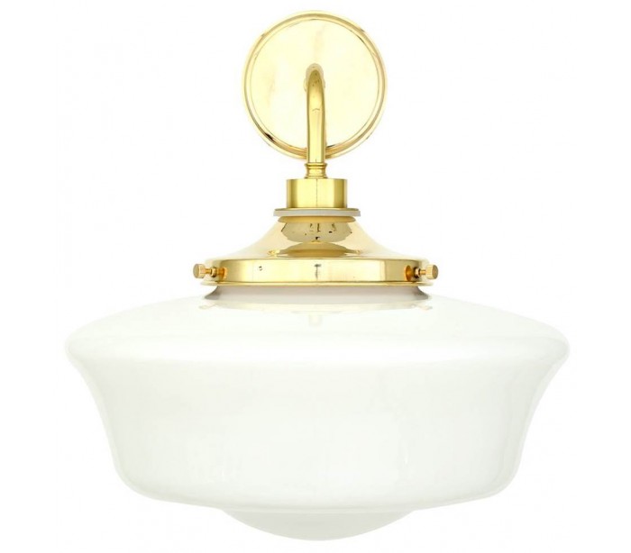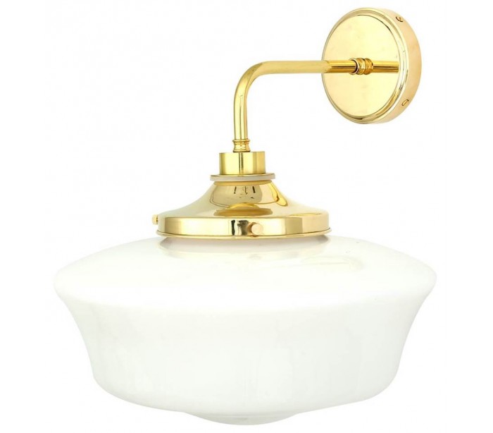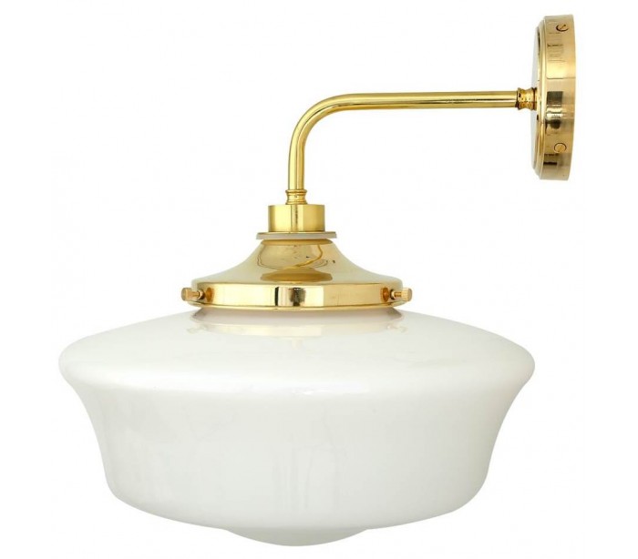Anath badeværelseslampe i et design i poleret messing og med skærm i satineret hvid glas. Lampen måler 45 cm i højden og 35 x 37,5 cm i bredde og dybde/fremspring.