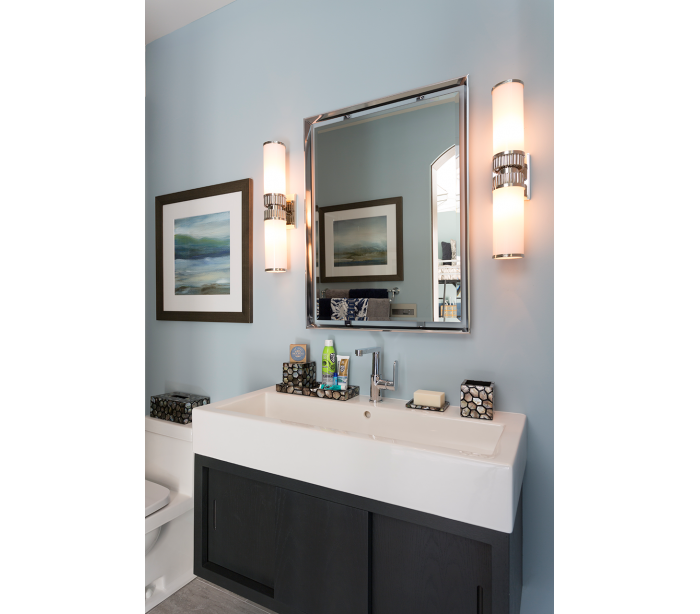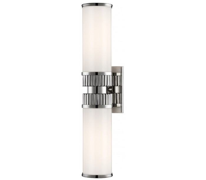 Harper badeværelseslampe i et design, fremstillet i poleret nikkel lakeret stål og med skærm i hvid opalglas. Lampen måler 53,5 cm i højden og anvender 2 x E27 lyskilder.