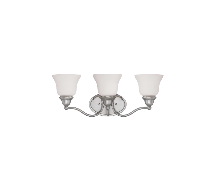 Yates 3 badeværelseslampe udført i et design af tingrå lakeret stål og med skærme i hvid opalglas. Lampen er fra amerikanske Savoy House og anvender 3 x E27 lyskilder og måler 22 cm i højden og 58 x 19 cm i bredde og dybde/fremspring.