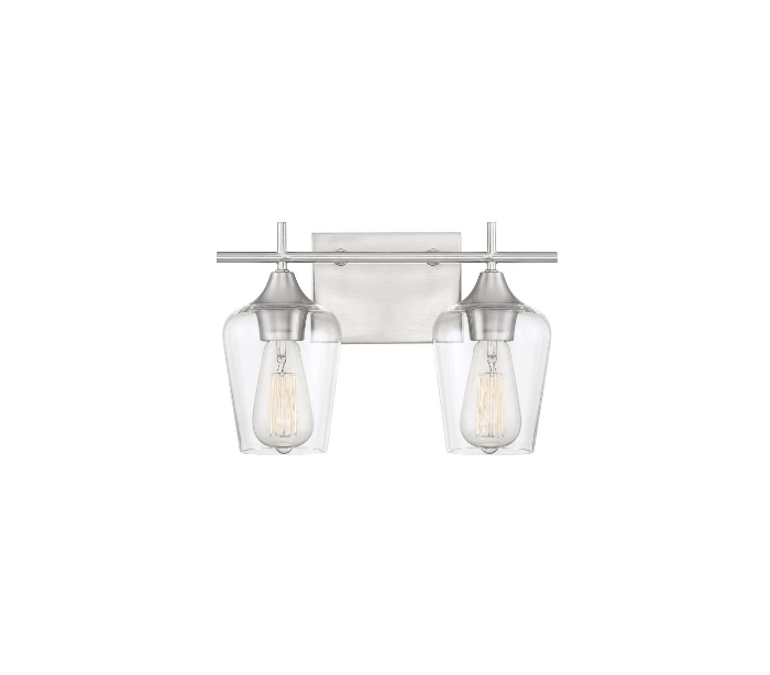 Octave 2 badeværelseslampe udført i et design af satineret nikkel lakeret stål og med skærme i klart glas. Lampen er fra amerikanske Savoy House og anvender 2 x E27 lyskilder og måler 23 cm i højden og 35 x 14 cm i bredde og dybde/fremspring.