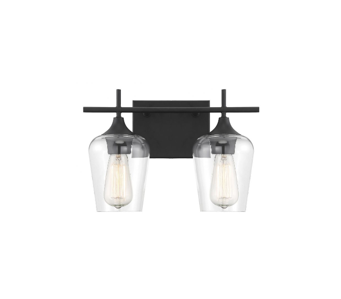 Octave 2 badeværelseslampe udført i et design af mat sortlakeret stål og med skærme i klart glas. Lampen er fra amerikanske Savoy House og anvender 2 x E27 lyskilder og måler 23 cm i højden og 35 x 14 cm i bredde og dybde/fremspring.