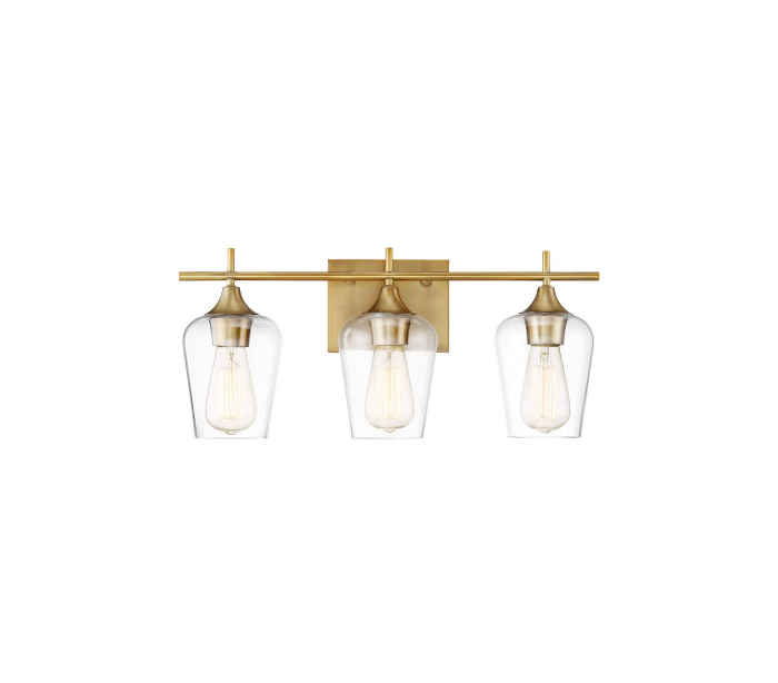 Octave 3 badeværelseslampe udført i et design af varm messinglakeret stål og med skærme i klart glas. Lampen er fra amerikanske Savoy House og anvender 3 x E27 lyskilder og måler 23 cm i højden og 53 x 14 cm i bredde og dybde/fremspring.