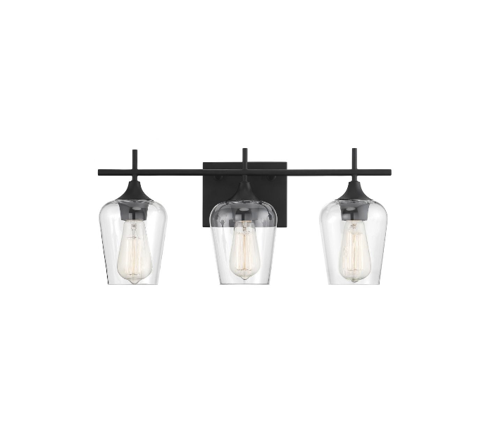 Octave 3 badeværelseslampe udført i et design af mat sortlakeret stål og med skærme i klart glas. Lampen er fra amerikanske Savoy House og anvender 3 x E27 lyskilder og måler 23 cm i højden og 53 x 14 cm i bredde og dybde/fremspring.