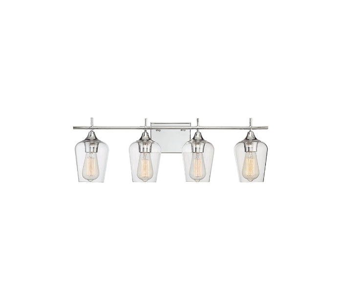 Octave 4 badeværelseslampe udført i et design af poleret kromlakeret stål og med skærme i klart glas. Lampen er fra amerikanske Savoy House og anvender 4 x E27 lyskilder og måler 23 cm i højden og 73 x 14 cm i bredde og dybde/fremspring.