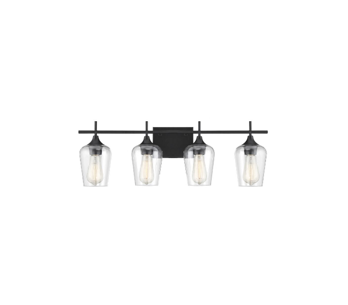 Octave 4 badeværelseslampe udført i et design af mat sortlakeret stål og med skærme i klart glas. Lampen er fra amerikanske Savoy House og anvender 4 x E27 lyskilder og måler 23 cm i højden og 73 x 14 cm i bredde og dybde/fremspring.