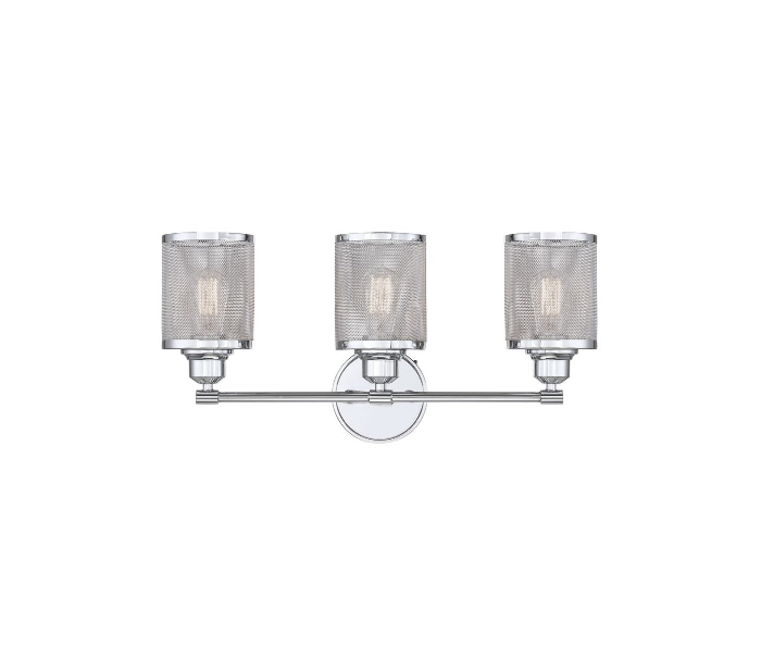Salvador 3 badeværelseslampe udført i et design af poleret kromlakeret stål og med skærme i grå mesh net. Lampen er fra amerikanske Savoy House og anvender 3 x E27 lyskilder og måler 29 cm i højden og 61 x 17 cm i bredde og dybde/fremspring.