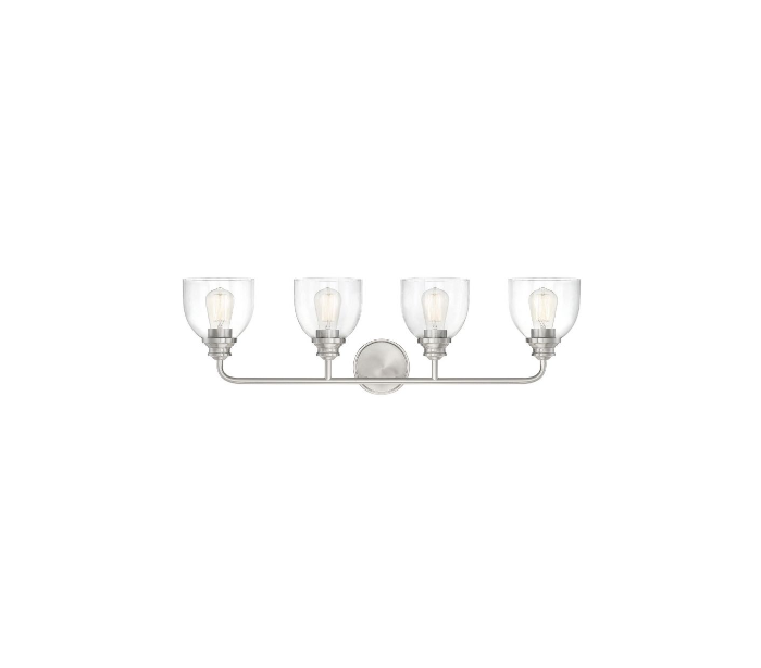 Vale 4 badeværelseslampe udført i et design af satineret nikkel lakeret stål og med skærme i klart glas. Lampen er fra amerikanske Savoy House og anvender 4 x E27 lyskilder og måler 25 cm i højden og 84 x 18 cm i bredde og dybde/fremspring.