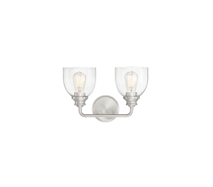Vale 2 badeværelseslampe udført i et design af satineret nikkel lakeret stål og med skærme i klart glas. Lampen er fra amerikanske Savoy House og anvender 2 x E27 lyskilder og måler 25 cm i højden og 37 x 18 cm i bredde og dybde/fremspring.
