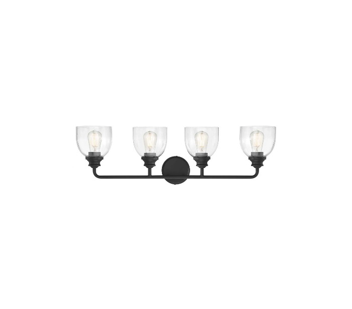 Vale 4 badeværelseslampe udført i et design af sortlakeret stål og med skærme i klart glas. Lampen er fra amerikanske Savoy House og anvender 4 x E27 lyskilder og måler 25 cm i højden og 84 x 18 cm i bredde og dybde/fremspring.