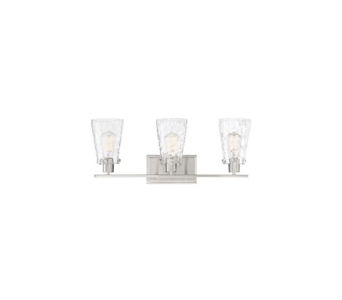 Vaughan 3 badeværelseslampe udført i et design af satineret nikkel lakeret stål og med skærme i klart bølget glas. Lampen er fra amerikanske Savoy House og anvender 3 x E27 lyskilder og måler 23 cm i højden og 60 x 15 cm i bredde og dybde/fremspring.