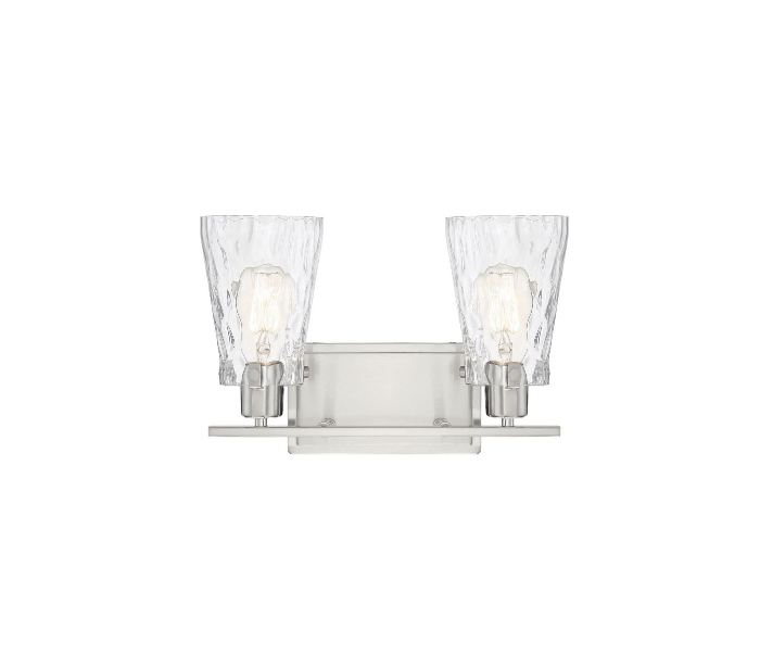 Vaughan 2 badeværelseslampe udført i et design af satineret nikkel lakeret stål og med skærme i klart bølget glas. Lampen er fra amerikanske Savoy House og anvender 2 x E27 lyskilder og måler 23 cm i højden og 36 x 15 cm i bredde og dybde/fremspring.