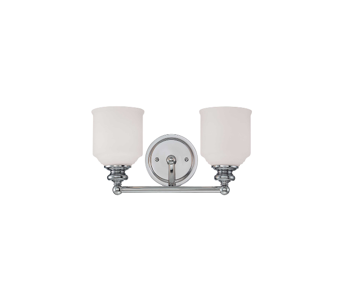Melrose 2 badeværelseslampe udført i et design af poleret kromlakeret stål og med skærme i hvid opalglas. Lampen er fra amerikanske Savoy House og anvender 2 x E27 lyskilder og måler 20 cm i højden og 37 x 17 cm i bredde og dybde/fremspring.