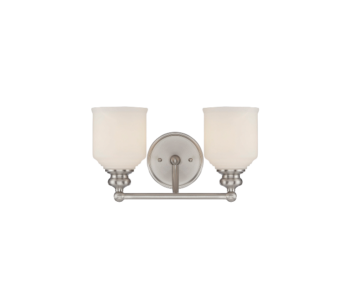 Melrose 2 badeværelseslampe udført i et design af satineret nikkel lakeret stål og med skærme i hvid opalglas. Lampen er fra amerikanske Savoy House og anvender 2 x E27 lyskilder og måler 20 cm i højden og 37 x 17 cm i bredde og dybde/fremspring.