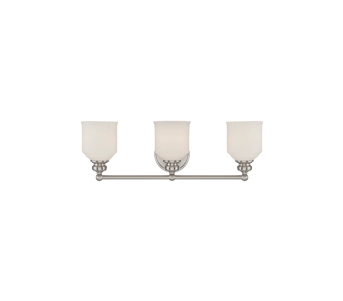 Melrose 3 badeværelseslampe udført i et design af satineret nikkel lakeret stål og med skærme i hvid opalglas. Lampen er fra amerikanske Savoy House og anvender 3 x E27 lyskilder og måler 20 cm i højden og 61 x 17 cm i bredde og dybde/fremspring.