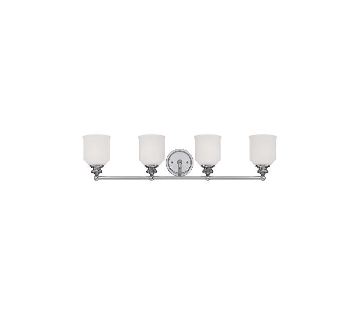 Melrose 4 badeværelseslampe udført i et design af poleret kromlakeret stål og med skærme i hvid opalglas. Lampen er fra amerikanske Savoy House og anvender 4 x E27 lyskilder og måler 20 cm i højden og 85 x 17 cm i bredde og dybde/fremspring.