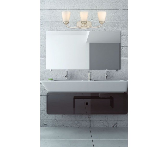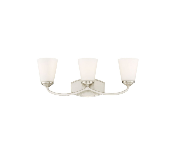 Jordan 3 badeværelseslampe udført i et design af satineret nikkel lakeret stål og med skærme i hvid opalglas. Lampen er fra amerikanske Savoy House og anvender 3 x E27 lyskilder og måler 23 cm i højden og 58 x 14 cm i bredde og dybde/fremspring.