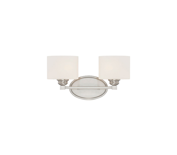 Kane 2 badeværelseslampe udført i et design af satineret nikkel lakeret stål og med skærme i hvid opalglas. Lampen er fra amerikanske Savoy House og anvender 2 x E27 lyskilder og måler 22 cm i højden og 41 x 14 cm i bredde og dybde/fremspring.