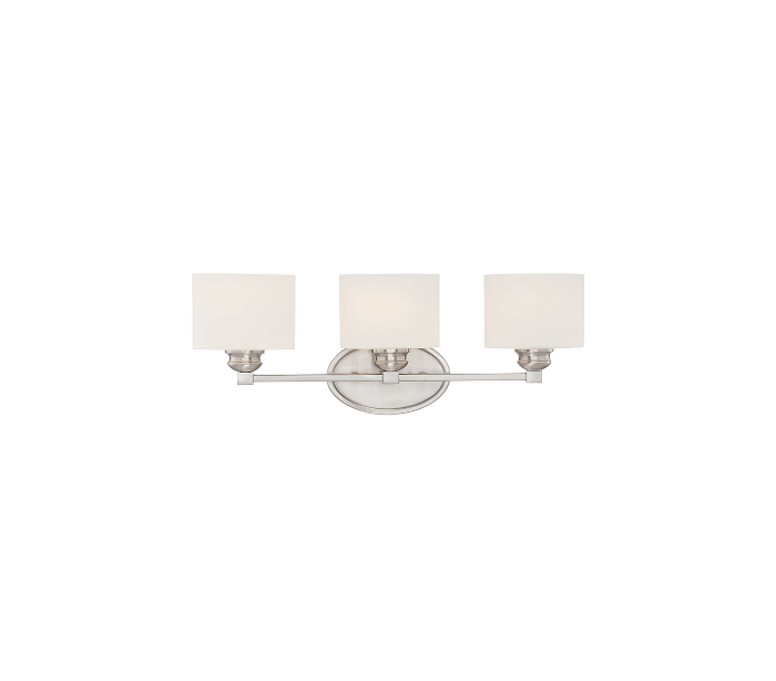 Kane 3 badeværelseslampe udført i et design af satineret nikkel lakeret stål og med skærme i hvid opalglas. Lampen er fra amerikanske Savoy House og anvender 3 x E27 lyskilder og måler 22 cm i højden og 61 x 14 cm i bredde og dybde/fremspring.