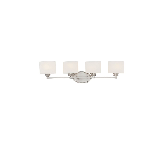 Kane 4 badeværelseslampe udført i et design af satineret nikkel lakeret stål og med skærme i hvid opalglas. Lampen er fra amerikanske Savoy House og anvender 4 x E27 lyskilder og måler 22 cm i højden og 84 x 14 cm i bredde og dybde/fremspring.